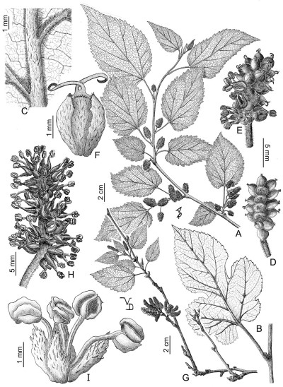 Árboles monoicos o dioicos, de 3-15 m de alto, con corteza castaña; ramas puberulentas o glabras, con peridermis castaña. Hojas con láminas ovadas, subovadas o anchamente elípticas de 5-15(-30) × 5-9(-16) cm, enteras o 3-9-lobadas, membranáceas, base redondeada, truncada o cordada, ápice agudo a brevemente acuminado, margen crenado a serrado-crenado, marcadamente 3-nervadas en la base, cara adaxial puberulenta, lisa o escabrosa, cara abaxial glabra o levemente puberulenta en los nervios, con 3-7 pares de venas laterales; pecíolo de 0,5-3 cm largo; estípulas de 5-12 mm de largo, puberulentas a tomentosas, caducas. Inflorescencias estaminadas en espigas de 0,5-2 cm de largo, solitarias o apareadas en los nudos, ebracteadas o con brácteas interflorales poco conspicuas; pedúnculo de 5-15 mm de largo, glabro a densamente pubérulo. Flores estaminadas sésiles o con pedúnculo hasta de 1,5 mm de largo, perianto blanco-amarillento; tépalos libres de 1-1,7 × 1 mm, pubescentes, membranáceos; estambres con filamentos de 1-3 mm de largo, anteras de 0,5-1 mm de largo; pistilodio elipsoidal de 1 mm de largo, pubescente. Inflorescencias pistiladas en espigas subglobosas, de 0,5-1,5 cm de largo, péndulas, ebracteadas o con brácteas interflorales poco conspicuas; pedúnculo de 5-15 mm de largo, glabro a escasamente pubérulo. Flores pistiladas sésiles, densamente dispuestas, con el perianto verde-amarillento a morado-violáceo o blanco en el fruto; tépalos obovados, de 1,5-2 × 1,5 mm, connados en su base; ovario de 1-1,5 mm de largo, estilo de 1,5 mm de largo o ausente, estigmas de 0,5-3,5 mm de largo, algo espiralados. Frutos cónicos, blanquecinos a castaños. Semillas más o menos comprimidas; embrión curvo, cotiledones oblongos más cortos que la radícula.