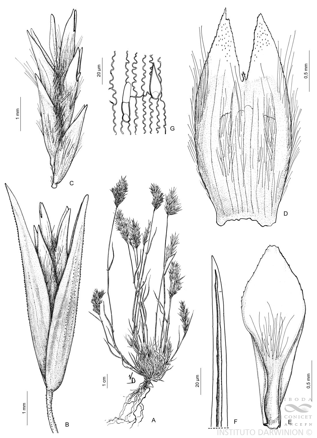 A. Planta. B. Espiguilla, vista lateral. C. Antecios. D. Lemma, vista dorsal. E. Pálea, vista dorsal. F. Pelo de la lemma, parte distal. G. Epidermis de la lemma mostrando un micropelo bicelular y un aguijón.