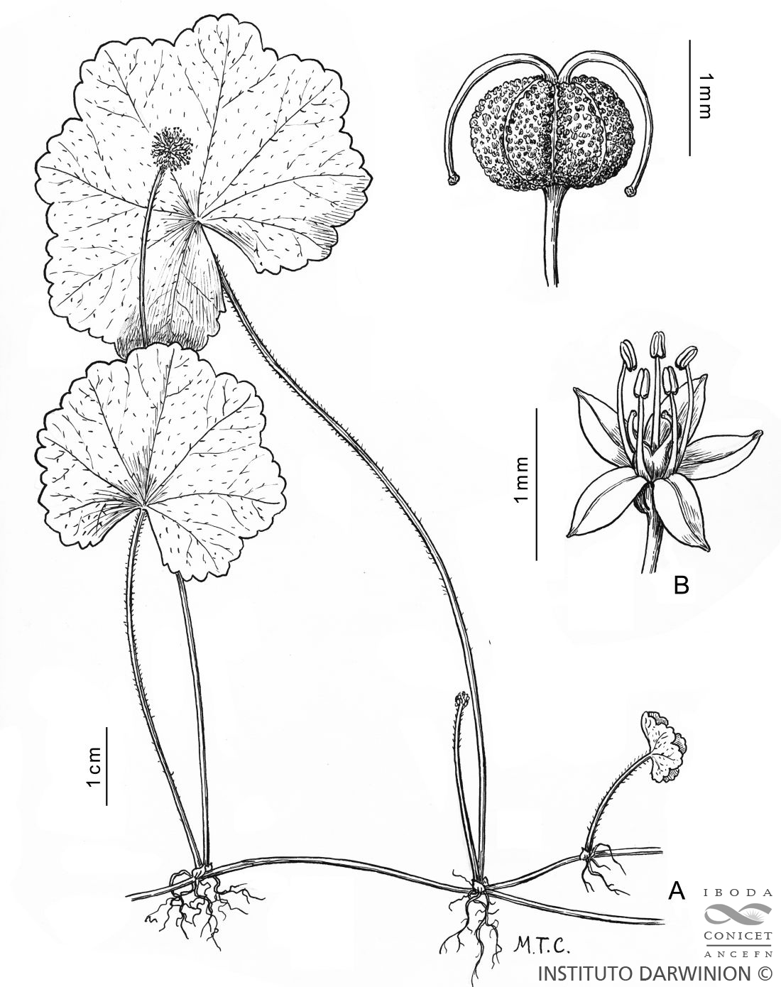 Plantas perennes, tallos delgados, rastreros o subsuperficiales. Hojas paláceas, pecíolos de 0,5-8(-20) cm de largo, hirsutos, principalmente en su porción distal; lámina orbicular-reniforme, de 1,5-8 cm de diámetro, 9-palmatinervada, débilmente 7-9-lobada, escasamente pilosa en ambas caras o sólo en la adaxial; lobulos obtusos, anchamente triangulares o redondeados, crenados, seno basal profundo, angosto, alcanzando el pecíolo, o casi. Umbelas simples, 15-40-floras, pedúnculo superando la hoja opuesta, hirsuto, por lo menos hacia arriba. Flores con pedicelos de 1-5 mm de largo, patentes y reflejos, pétalos blancos, estilos acrecentes de 0,5-1, 2 mm. Frutos algo comprimidos, orbiculares a trans-elipsoides, de 1-1,2 × 1,2-1,8 mm, con base emarginada, costillas más o menos prominentes, agudas o redondeadas, estilos reflejos llegando casi hasta la base; epicarpio liso o algo rugoso, amarillento o ferrugíneo.