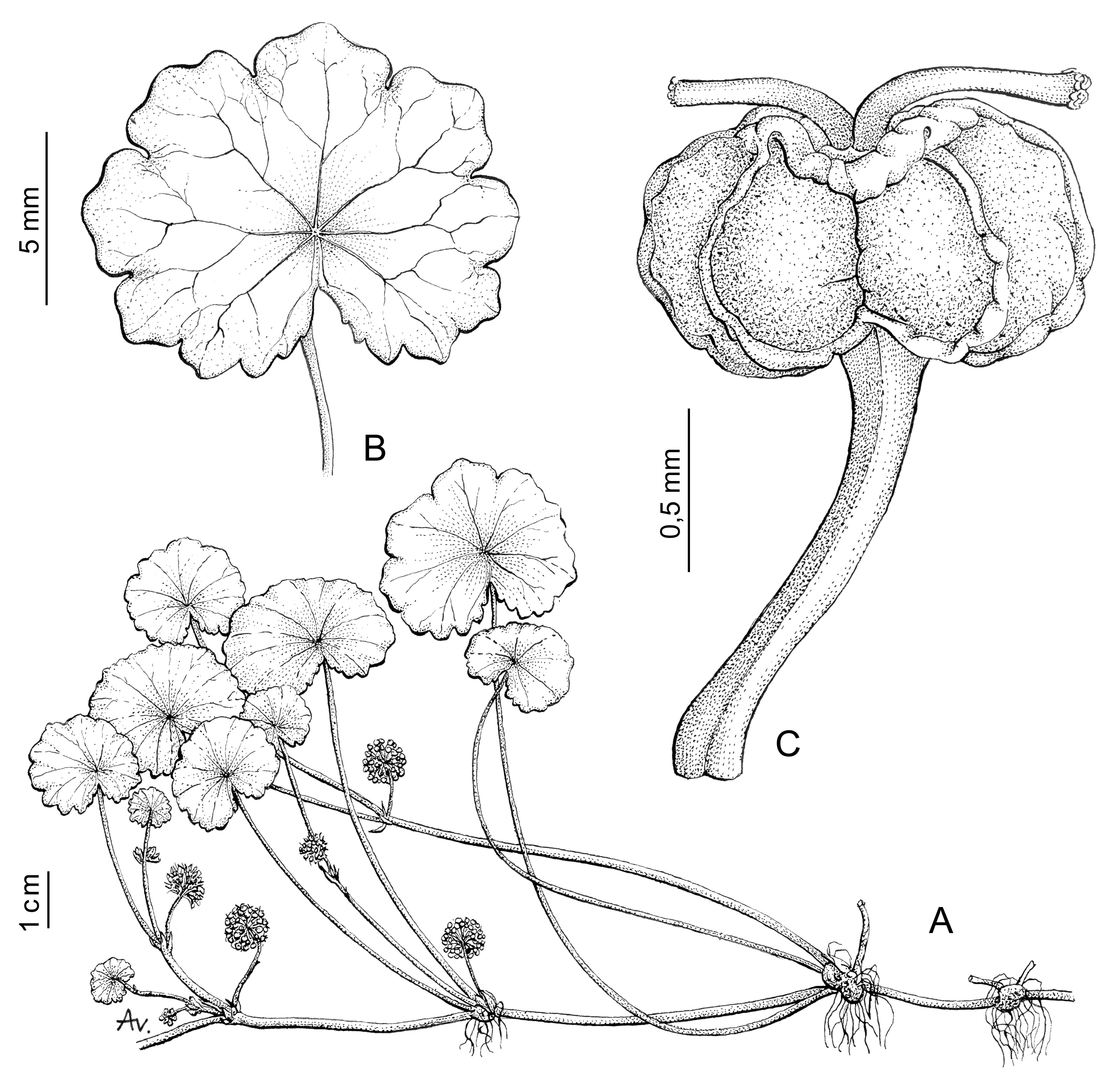Plantas perennes, delicadas; tallos rastreros o subterráneos, a veces apoyantes y subescandentes, filiformes, de 0,5-1,5 mm de diámetro, generalmente glabros, a veces con algunos pelos cuando jóvenes, frecuentemente con tubérculos globosos hasta de 5 mm de diámetro en los nudos. Hojas peltadas, pecíolos de 0,5-12 cm de largo, glabros o ralamente pilosos distalmente; lámina transovada-orbicular, de 0,5-3,5 cm de diámetro, 6-9nervada, crenada a débilmente 5-9-lobada, senos muy poco profundos, el basal mayor, sin alcanzar el pecíolo, glabra en ambas caras. Umbelas simples, 10-30(-40)-floras, pedúnculo de 0,5-4 cm de largo, generalmente más corto que el pecíolo de la hoja opuesta, Flores con pedicelos de 1-3 mm de largo; pétalos blancos a veces con manchas rojizas, estilos de apenas 0,3 mm de largo en antesis, luego acrescentes hasta 0,6 mm en el fruto. Frutos dídimos, 0,5-0,7 × 1-1,5 mm, mericarpos subglobosos con costillas evidentes, filiformes a muy brevemente aladas; epicarpio finamente reticulado venoso, castaño rojizo.
