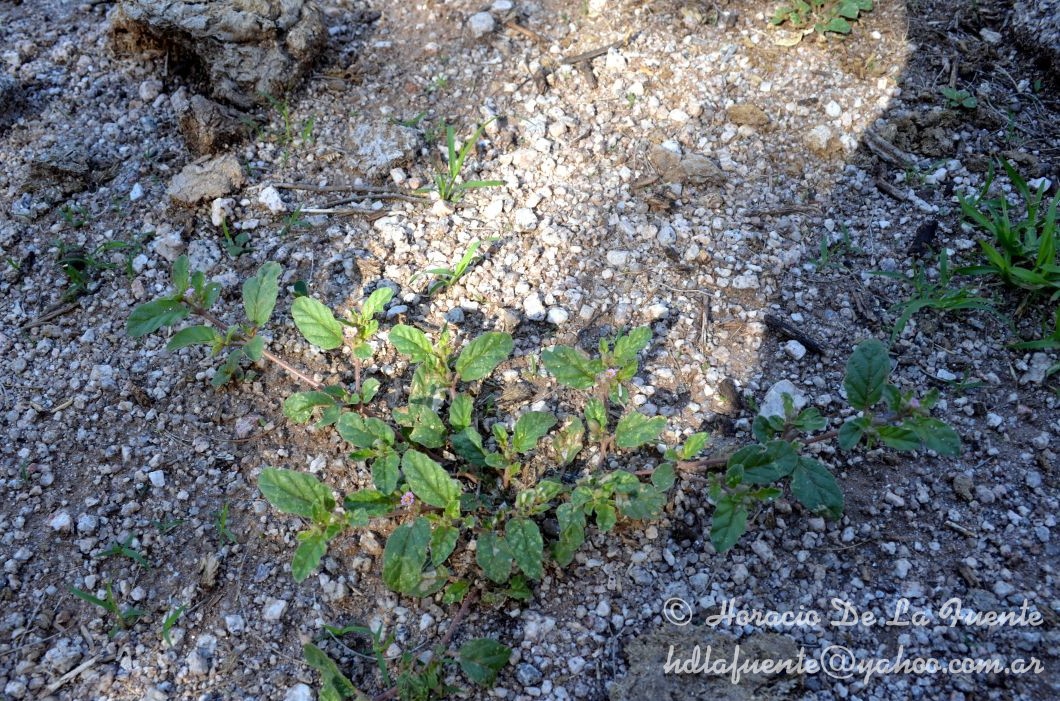 Hierba perenne, ascendente, de 30-50 cm de alto; tallos glandular-pubescentes, lignificados en la base; raíces engrosadas. Hojas discolores, ovado-elípticas, ca. 30 × 15 mm, ápice agudo, base obtusa, borde entero a sinuoso. Inflorescencias parciales en glomérulos 10-20-floros; pedúnculos ca. 50 mm de largo, persistentes. Flores ca. 8 mm; perigonio distal campanulado, tépalos hendidos, no pubescentes en la escotadura; rosado claro a rojizos; tricomas glandulares estipitados entre las costillas; estambres 3-6, muy exertos; estilo más largo que los filamentos; estigma exerto; nectario conspicuo hasta el ápice del ovario. Antocarpo obovoide, ca. 3,4 × 1,5 mm, 5(-6)-costado, ápice redondeado.