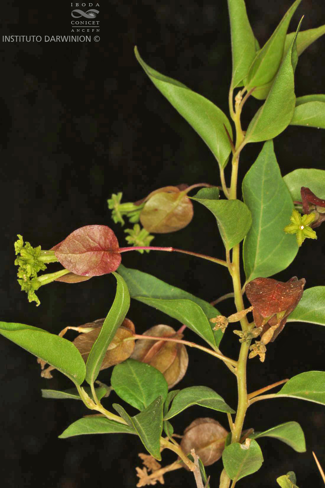 Arbusto o árbol de 3-10 m de alto; espinas de 20 × 1 mm, simples. Hojas alternas; pecíolo de 10-20 mm de largo; lámina lanceolada a ovado-lanceolada, de 50-60 × 20-40 mm, glabra, ápice atenuado. Inflorescencia 3-(4)-flora; pedúnculo de 10 mm de largo, a menudo ramificado surgiendo del ápice de una rama espinescente; brácteas ovales, de 18 × 10 mm, glabras, papiráceas, verdosas o rosado-violáceas. Flor recaulescente con la bráctea; perigonio hipocrateriforme, de 17-20 mm de largo, amarillo-verdoso, (4-)5-nervado, porción media muy contraída; tépalo con lóbulo central agudo, ápice glanduloso, glabro, lóbulos comisurales hendidos, obtusos, no glandulosos, glabros; estambres 7-8; ovario fusiforme, de 3 × 1 mm; estilo de 2,5 mm de largo; estigma de 3 mm de largo.