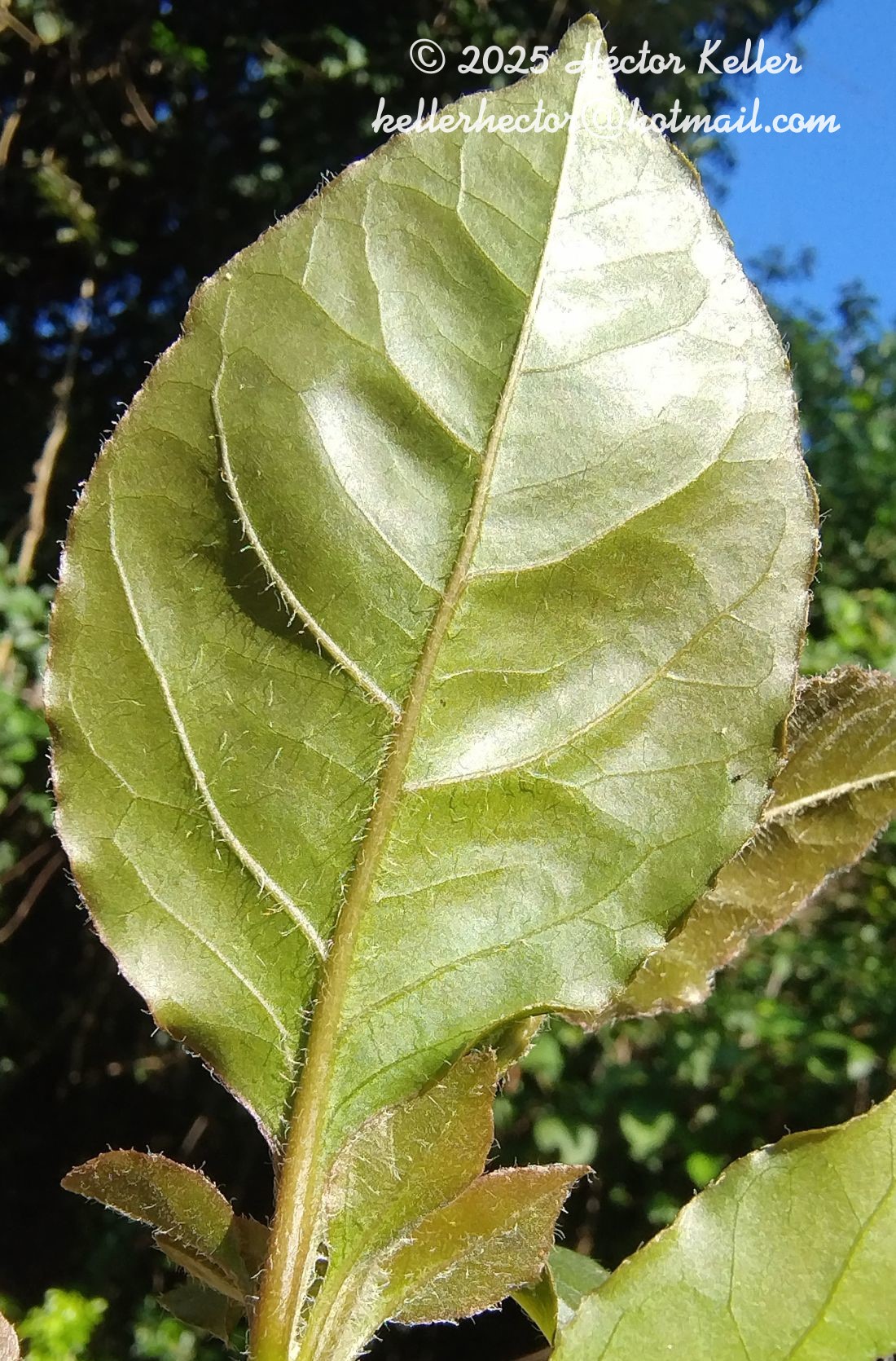 Arbustos o lianas trepadoras, hasta de 10-18(-25) m de alto; corteza violácea cuando seca; ramas laterales opuestas o subopuestas, rectas, ramificadas en 90° o más, con espinas recurvas en los nudos. Hojas opuestas, alternas o fasciculadas en braquiblastos, elípticas, lámina de (3-)5-9(-11) × (2-)4-7(-10) cm, glabra, ápice obtuso, agudo o acuminado, base atenuada. Inflorescencia compuesta de cimas aglomeradas o algo laxas, globosas las pistiladas más densas, las terminales trímeras. Flores 4-5-meras, las estaminadas con perigonio campanulado, piloso, blanco- verdoso a blanco-amarillento, de 2-5 × 3-5 mm; lóbulos reflexos; estambres 6-8, muy exertos en antesis, pistilodio presente; flores pistiladas con perigonio tubuloso, verdoso-amarillento, carnoso, pubescente, de 2-3(-5) × 1-2 mm. Antocarpo seco, cilíndrico-clavado, truncado, de 7-16 × 2-5 mm, 4-5-costado, levemente pubescente, con 4-5 líneas completas de glándulas 1-2 seriadas en la línea de resalto; glándulas estipitadas secretoras de mucílago. Utrículo adherido al antocarpo. Semillas perispermadas amiláceas, embrión recto.