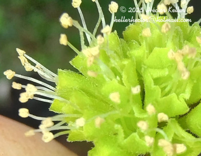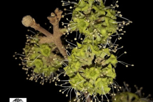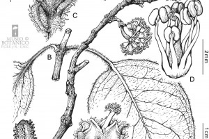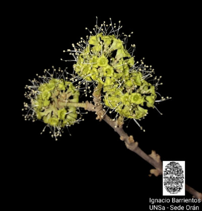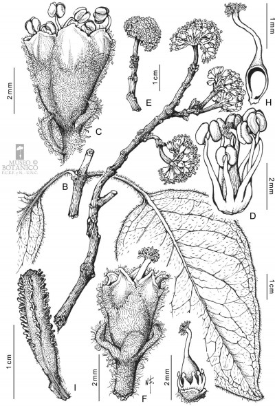 Árboles de 4-15(-21) m de alto, tronco de 0,60-1 m de diámetro; corteza grisácea y poco rugosa. Hojas pecioladas, pecíolo de 0,8-3(-5) cm de largo, opuestas o casi, fasciculadas en los braquiblastos, anchamente elípticas, de 2,6-9,5 × 1,5-6,6 cm, con base aguda. Inflorescencias en cimas aglomeradas globosas, de 0,9-2 cm de diámetro; pedúnculo piloso-tomentoso, de 0,5-1,1 y hasta 5 cm de largo al fructificar. Flores 4-5-meras, las estaminadas campanuladas, de 2-4 mm de largo, tomentosas, con 5 lóbulos cortos; estambres 5-8, exertos, pistilodio elipsoide. Flores pistiladas cilíndricas, tubulosas, tomentosas, estaminodios 5-8 evidentes o no, gineceo con el ovario cilíndrico atenuado en un estilo elongado, estigma exerto, ramas estigmáticas cortas. Antocarpo claviforme, de (10-)16-20 mm de largo, glabro, 10-costillado, con 10 líneas de glándulas estipitadas de pie amarillento y ápice desarrollado, dispuestas en los surcos o en las costillas a lo largo de la mitad distal del antocarpo; mucílago espeso entre los pedicelos. Embrión recto, perisperma amiláceo a gelatinoso.