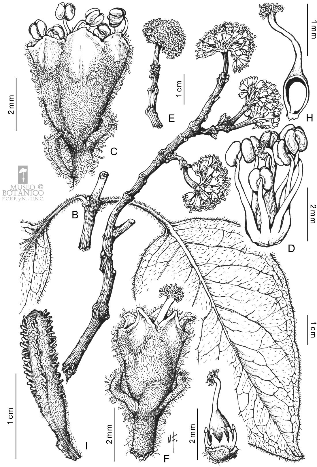 A. Rama masculina. B. Nudo con hojas opuestas. C. Flor masculina. D. Flor masculina sin perigonio. E. Inflorescencia femenina. F. Flor femenina. G. Flor femenina sin perigonio. H. Gineceo con el ovario cortado longitudinalmente para mostrar el único óvulo. I. Fruto (planta masculina y detalles de A. T. Hunziker 20728, CORD; planta femenina y detalles A. T. Hunziker 20726 y 20730, CORD).