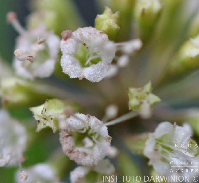 Arbusto de 2 m de alto, ramas menores divaricadas, glabras, nudos abultados. Hojas opuestas, pecioladas, glabras, lámina oval, de 30-65 × 15-35 mm, acuminada. Inflorescencia en umbelas simples, pedunculadas, terminales. Flores pediceladas, pedicelos de 1-3 mm de largo; perigonio tubuloso-campanulado, blanco; estambres 6-9; ovario de contorno oblongo; estigma papiloso, exerto. Antocarpo claviforme, de 10 × 2 mm, 5-costado, curvo, atenuado hacia el ápice, glándulas verrugosas en la mitad superior de las costillas.