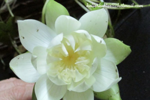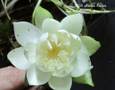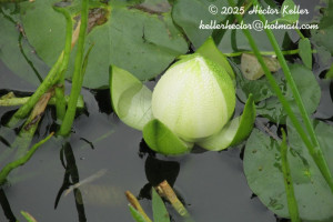 Plantas con rizomas glabros. Hojas con pecíolos de 2-4(-5) mm de diámetro, con 2 canales aeríferos mayores, rodeados por otros 4-6 canales menores en sección transversal; láminas elípticas a suborbiculares, de 9-17 × 7,5-15 cm, base con lóbulos redondeados a obtusos, con un profundo seno basal que llega a 1-9 mm de la inserción del pecíolo, ápice redondeado, membranáceas a subcoriáceas, nervios principales 11-16, radiales, unidos por nervios transversales oblicuos en la parte media de la lámina. Flores solitarias, de 6-9(-11) cm de diámetro; pedicelos de 4-6(-7) mm de diámetro, con un anillo interior de 6-7 canales aeríferos mayores rodeados por otros 12-14 canales menores en sección transversal; cáliz compuesto por 4 sépalos triangularlanceolados de 2-5(-6,5) × 1-2(-3) cm, coriáceos; corola compuesta por 12-20 pétalos, los 4 externos similares a los sépalos y de igual longitud, los restantes más cortos en cada ciclo, blancos; androceo compuesto por 35-85 estambres, los más externos hasta de 4 cm de largo; gineceo compuesto por 19-33 carpelos; procesos estilares de 4-8 mm de largo, claviformes e incurvos. Fruto no visto.