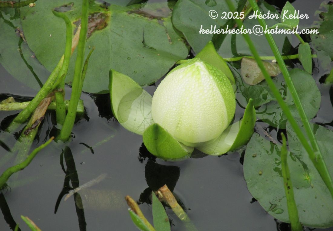 Plantas con rizomas glabros. Hojas con pecíolos de 2-4(-5) mm de diámetro, con 2 canales aeríferos mayores, rodeados por otros 4-6 canales menores en sección transversal; láminas elípticas a suborbiculares, de 9-17 × 7,5-15 cm, base con lóbulos redondeados a obtusos, con un profundo seno basal que llega a 1-9 mm de la inserción del pecíolo, ápice redondeado, membranáceas a subcoriáceas, nervios principales 11-16, radiales, unidos por nervios transversales oblicuos en la parte media de la lámina. Flores solitarias, de 6-9(-11) cm de diámetro; pedicelos de 4-6(-7) mm de diámetro, con un anillo interior de 6-7 canales aeríferos mayores rodeados por otros 12-14 canales menores en sección transversal; cáliz compuesto por 4 sépalos triangularlanceolados de 2-5(-6,5) × 1-2(-3) cm, coriáceos; corola compuesta por 12-20 pétalos, los 4 externos similares a los sépalos y de igual longitud, los restantes más cortos en cada ciclo, blancos; androceo compuesto por 35-85 estambres, los más externos hasta de 4 cm de largo; gineceo compuesto por 19-33 carpelos; procesos estilares de 4-8 mm de largo, claviformes e incurvos. Fruto no visto.
