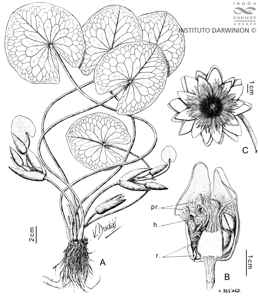 Plantas con rizoma lanoso; proliferaciones sumergidas, numerosas, con (3-)4 brácteas sepaloides, de (3-)4-6 cm de largo, que encierran un tubérculo densamente lanoso del cual se desarrollan proliferaciones secundarias pero de menor tamaño, con algunas hojas y raíces; 3(-4) proliferaciones se suceden a lo largo de un mismo pedicelo. Hojas con pecíolos de 4-6 mm de diámetro, con 8 canales aeríferos rodeados por otros 12 de menor tamaño en sección transversal; láminas elípticas a suborbiculares, de 10-15(-18) × 6-10(-15) cm, base con lóbulos obtusos, con un profundo seno basal que llega a 1-4 mm de la inserción del pecíolo, ápice obtuso a redondeado, coriáceas, nervios principales 13-18, radiales, unidos por nervios transversales oblicuos en hexágonos irregulares, los que disminuyen de tamaño hacia el borde de la lámina. Flores solitarias de 6-9 cm de diámetro; pedicelos de 5-8 mm de diámetro, con 6-18 canales aeríferos rodeados por otros12-24 canales de sección menor; cáliz compuesto por 4 sépalos ovados de 2-6(-7) × 1-2,5 cm, coriáceos; corola compuesta por 19-35 pétalos ovados, los externos de 3-6,5 × 1-3 cm, blanco-cremosos; androceo compuesto por 99-284 estambres, los más externos ca. 5,5 cm de largo; gineceo compuesto por 20-39 carpelos, procesos estilares de 6-11(-14) mm de largo, claviformes e incurvos. Fruto no visto.