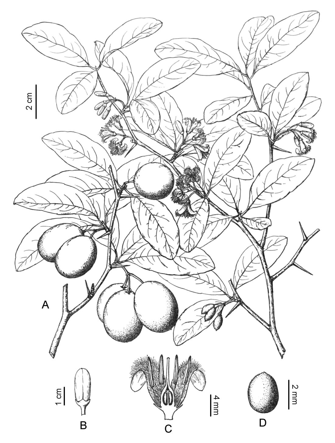 Arbustos o árboles, con espinas axilares hasta de 5 cm de largo. Hojas con pecíolo de 2-5 mm de largo; láminas de 1,2-4 × 0,8-2,5 cm, glaucas o no. Inflorescencias en umbela, subumbela, cima o flores solitarias; pedúnculo hasta de 14 mm de largo. Flores de 10-13 mm de largo; sépalos de 1-2(-3) mm de largo; pétalos de 6-15 × 2-2,6 mm; filamentos estaminales de 3-4,6 mm de largo, anteras de 3-4,4 mm de largo; ovario de 3-3,8 mm de largo; estilo de 4-7 mm de largo. Fruto de 1,5-2,2 × 1-2 cm de diámetro. Semilla de 1,3-1,5 cm de largo × ca. 1 cm de diámetro.