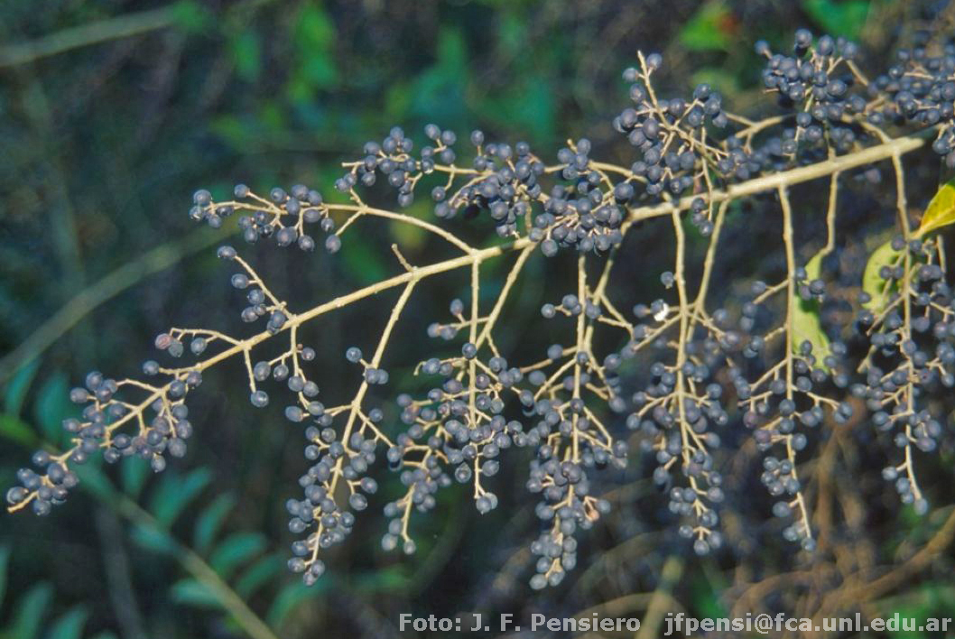 Árbol o arbusto de 2-6 m de alto, caducifolio. Hojas con láminas ovalado-elípticas, de 1,5-7 × 0,8-2,8 cm, opuestas, simples, enteras, a menudo algo onduladas, papiráceas, glabras, nervio medio prominente en la cara abaxial y pubescente; pecíolo de 3- 6 mm de largo, pubescente. Inflorescencia una panoja piramidal de 5-15 cm de largo, raquis pubescente; pedicelos de 1-2,5 mm de largo, bracteolados, glabros. Flores con el cáliz campanulado de 1,5 mm de largo, corola de 4,5-5 mm de largo, profundamente 4- lobada, blanca; estambres de 6-7 mm de largo. Fruto de 5 × 3-4 mm, globoso, violáceo-negruzco, glabro, en general 2-seminado.
