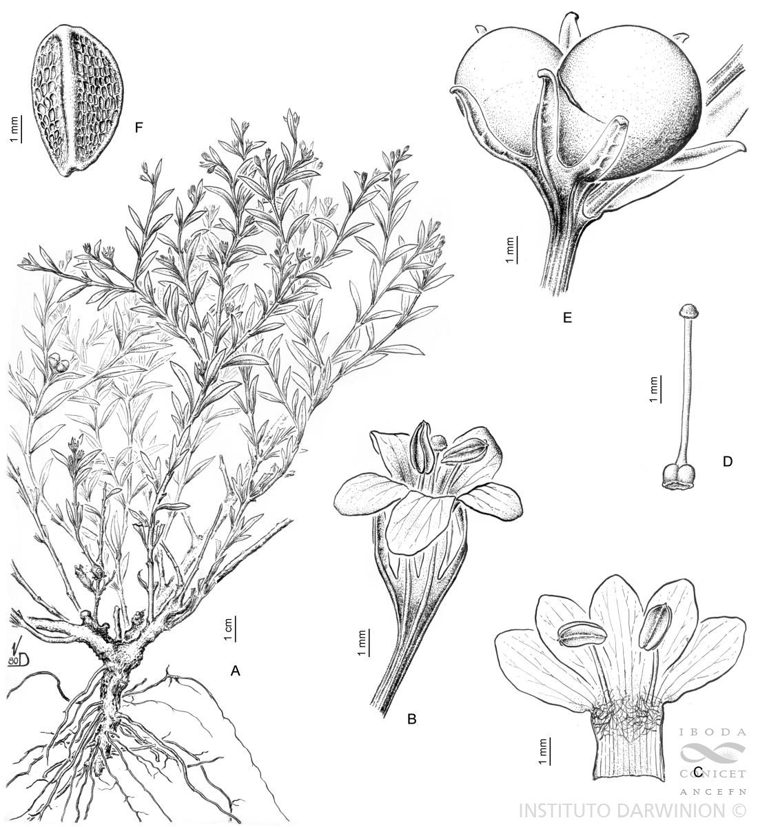 A. Planta. B. Flor. C. Corola abierta con estambres. D. Gineceo. E. Fruto. F. Semilla.