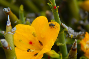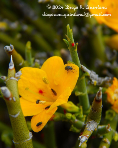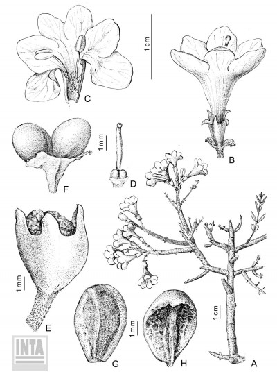 Arbusto de 0,30-1,50 m de alto, con las ramas terminando en espinas. Hojas de 5-10 × 1-1,5 mm, opuestas, enteras, angostamente elípticas a ovadas, carnosas, a veces caducas dando el aspecto de una planta áfila. Inflorescencia de flores solitarias o de a pares en las ramas apicales. Flores de 30-35 mm de largo, amarillas, vistosas, suavemente perfumadas, caedizas, pedunculadas, sostenidas por 2-3 brácteas pequeñas, ovadas, que apenas cubren el pedicelo; pedicelo de 1-3 mm de largo; cáliz de 3-4 mm de largo, campanulado, con 5-6 lóbulos de 1/3-1/4 del largo del tubo, triangulares, agudos, reflexos, cubiertos interiormente de pelos glandulosos pluricelulares y papilas, persistentes y hendiéndose a la madurez del fruto; corola ca. 25 mm de largo, infundibuliforme, con 5-6 lóbulos ca. 8 × 6 mm, anchamente ovados, tubo de 1-1,5 cm de largo, glabro; estambres exertos, adheridos por su base al tubo de la corola, la porción libre ensanchada en la base y cubierta de papilas que se prolongan como una faja en la parte superior del tubo; anteras ovadas; ovario subgloboso, deprimido, cortamente 2-lobado, 2-locular con 2 óvulos por lóculo; estilo de 1,7-2 cm de largo; estigma capitado. Fruto de 7 × 5,5 mm, indehiscente, mericarpios divergentes a la madurez, con frecuencia se encuentra un solo mericarpio y el otro abortado; pericarpo duro, oscuro, muy lustroso en su interior. Semillas obovoides, ca. 5 × 3 mm, oscuras, ligeramente costadas.