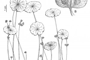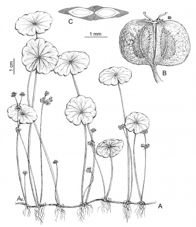Plantas perennes, enteramente glabras; tallos filiformes, rastreros a veces subterráneos. Hojas peltadas, pecíolos de 312(-30) cm de largo, lámina ± orbicular, de 1,5-6 cm de largo, 9-13nervada, débilmente 9-11-lobada y crenada, seno basal apenas insinuado. Pedúnculos iguales o más cortos que la hoja opuesta, Inflorescencias espiciformes, simples o 1-(2) veces bifurcadas, con las flores distribuídas sobre el raquis en vertcilos 2-7-floros, próximos entre sí en antesis, distantes 1-2,5 cm en la fructificación. Flores con pétalos blancos, crema o amarronados. Frutos muy comprimidos, obcordados en contorno, de 1-2 × 2-3 cm, con costillas dorsales agudas, las laterales filiformes, evidentes, estilos divergentes, hasta de 0,7 mm de largo; epicarpio castaño.