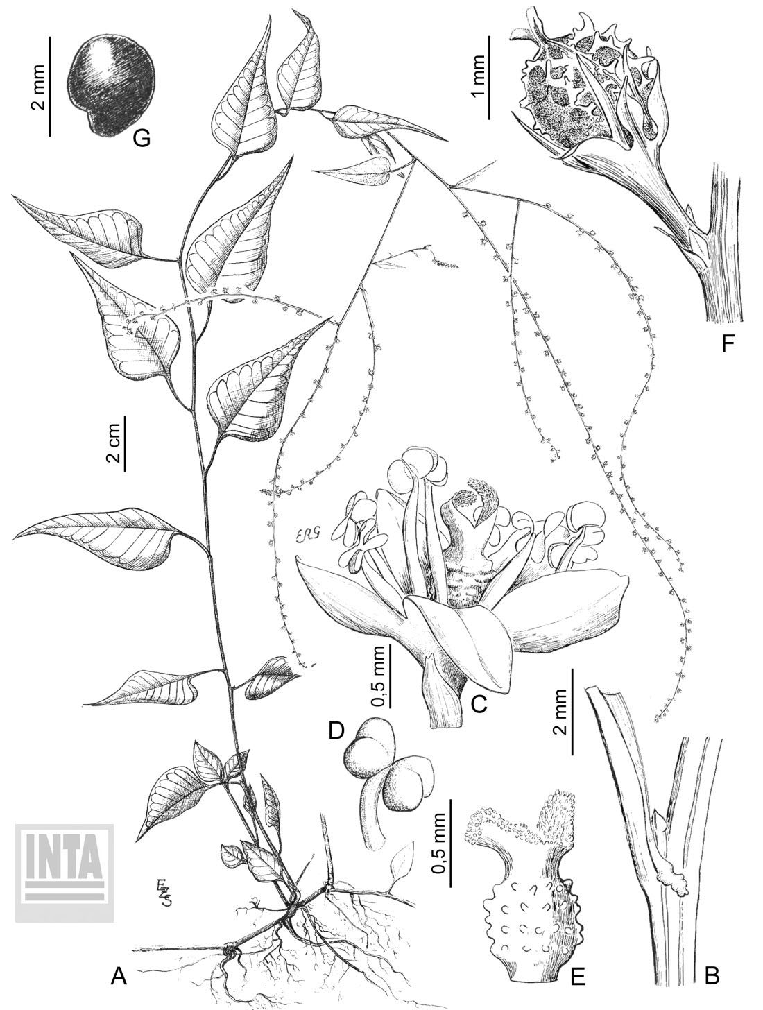 A. Planta. B. Detalle de estípulas. C. Flor. D. Estambre. E. Ovario y estigma. F. Fruto. G. Semilla