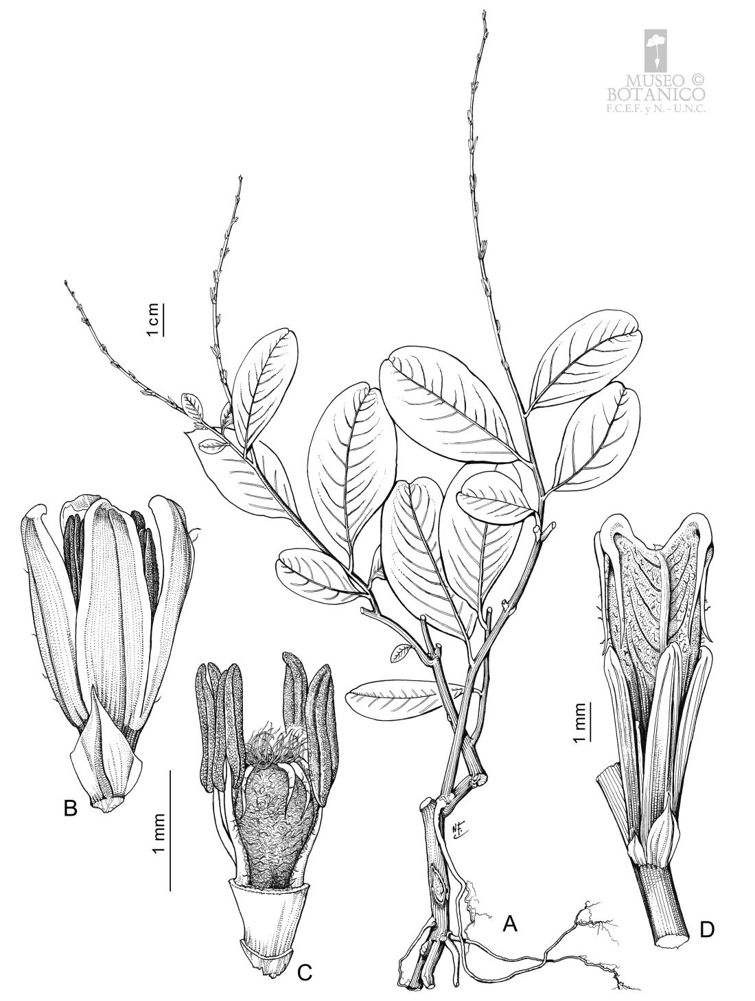 A. Planta. B. Flor y bráctea. C. Flor sin los tépalos, mostrando los estambres y el ovario. D. Fruto con los tépalos persistentes.