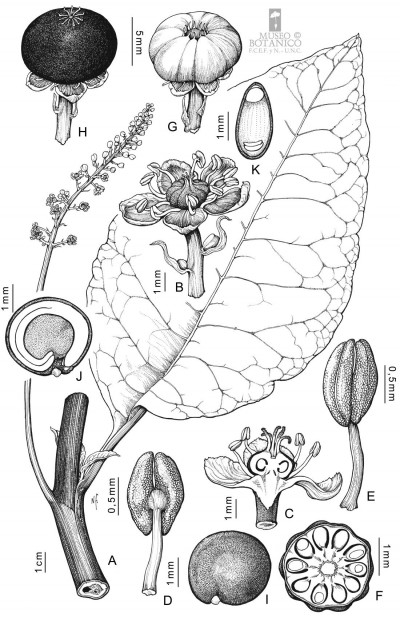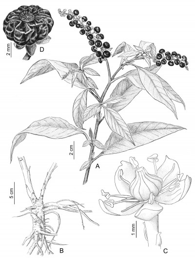 Hierbas perennes hasta ca. 3 m de alto, robustas, tallos erectos y suculentos, glabras. Hojas con láminas lanceolado-elípticas, elípticas o raramente ovadas, de 4-18(-30) × 2-12 cm, de ápice agudo, a veces mucronada, de base obtusa, atenuada, membranáceas, generalmente más obscuras en la cara adaxial; pecíolos hasta ca. 6 cm de largo. Inflorescencias racimosas, a veces tirsiformes en la base, hasta ca. 30(-40) cm de largo, racimos laxos, generalmente axilares, erectos a ligeramente péndulos, glabros a ligeramente papiloso-escamosos, pedúnculos y raquis frecuentemente rosados. Flores con pedicelos hasta de 6-12 mm de largo, frecuentemente rosados; bráctea linear-lanceolada, de 1-4 mm de largo, persistente; bractéolas 2, lanceoladas, de 1-1,5 mm de largo; tépalos 5, ovados a suborbiculares, de 1,5-2,5 mm de largo, más o menos iguales entre sí, blancos; estambres 10-12, dispuestos en un verticilo, con los filamentos de 1,5-2 mm de largo; anteras oblongas, de 0,5-0,8 mm de largo; ovario con 9-10 carpelos, unidos o a veces con los ápices libres, estilos conniventes. Fruto una baya de 5-8(-10) mm de diámetro, con 10 costillas paralelas en su superficie, negruzco. Semillas reniformes, de 2-2,5 mm de diámetro, negras, brillantes.