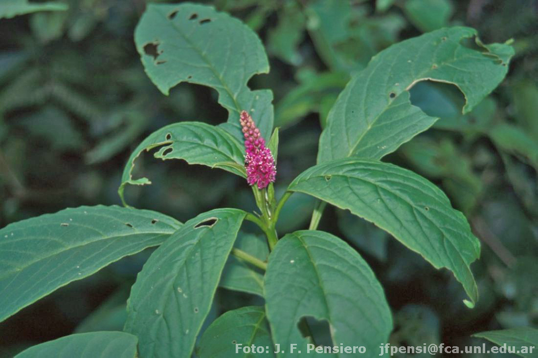 Phytolacca australis Phil. Pflanzenr. 4(Heft 39): 58. 1909 Cuando Philippi publica el nombre P. australis (Anales Univ. Chile 43: 536. 1873), diferencia ésta de P. bogotensis por presentar los pecíolos y las inflorescencias más cortas que sus hojas, pero proponiendo un nombre provisional a la especie, ya que escribe “podría llamarse P. australis”. Por este motivo, el nombre de Philippi se considera un nombre inválido (Art. 36. 1, ICBN), que posteriormente valida Walter, dando en su obra una descripción detallada de la especie.