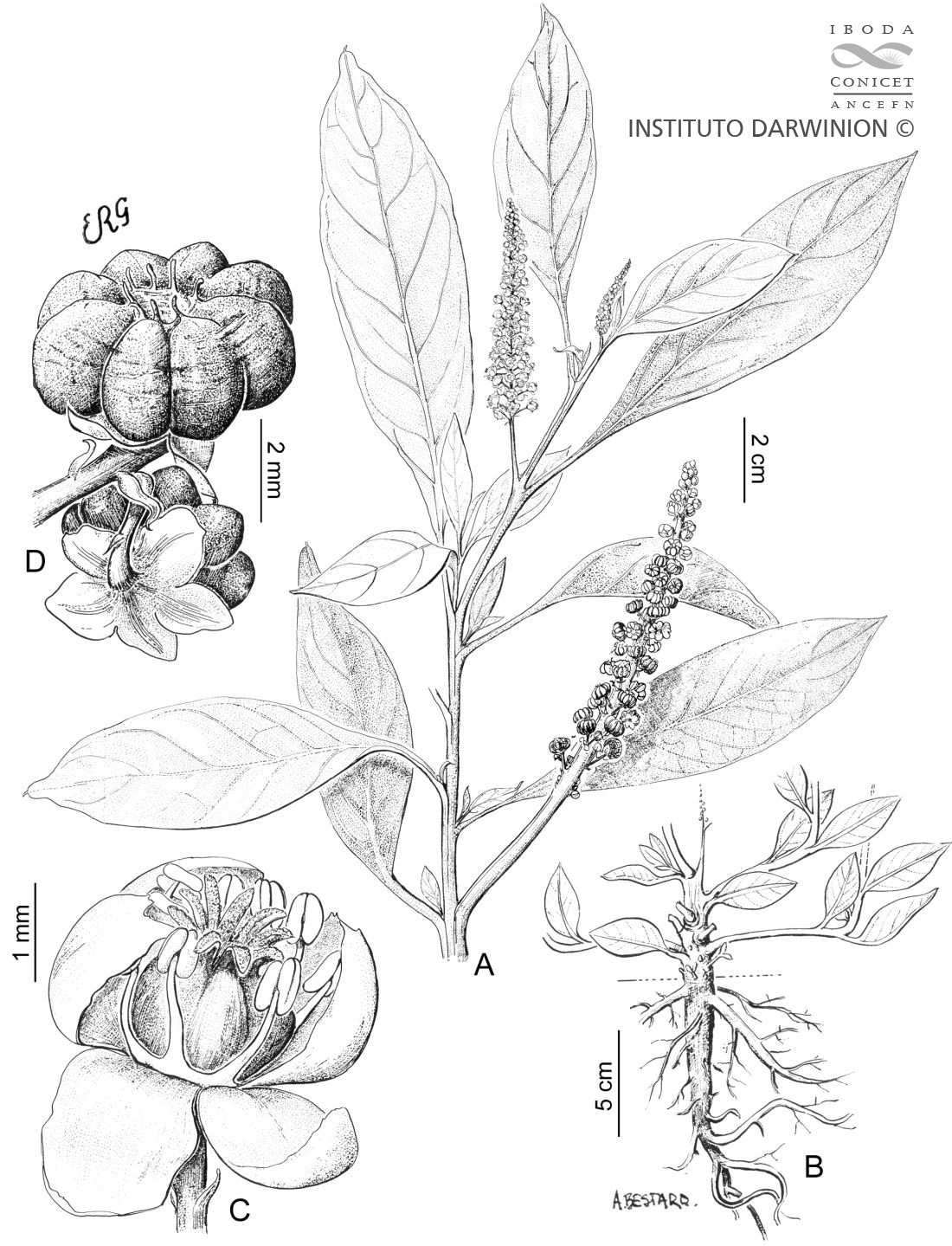 Hierbas de 0,40-2 m de alto, suculentas, glabras. Hojas con los pecíolos ca. 3,5 cm de largo o subsésiles; láminas lanceoladas a elípticas, de 5,5-18 × 2,5-7 cm, agudas a acuminadas, de base obtusa a atenuada, algo suculentas. Inflorescencias racimosas, de 5-20 cm de largo, axilares o terminales, escamosas. Flores con los pedicelos de 2-4 mm de largo; bráctea lanceolada, de 2-3 mm de largo; bractéolas 2, angostamente lanceoladas, de 1-1,2 mm de largo; tépalos 5, oblongos a ovados, de 2-3 × 1,2-2 mm, subiguales, rosados o blanquecinos; estambres 7-10, blancos, dispuestos en un verticilo, raramente en un segundo verticilo, con los filamentos de ca. 2 mm de largo, anteras de 0,8-0,9 mm de largo; ovario con 7-10 carpelos, connados. Fruto una baya de 1-1,3 mm de largo × 5-6 mm de diámetro, con 7-10 costillas longitudinales, los tépalos persistentes, negra-morada. Semillas no vistas.
