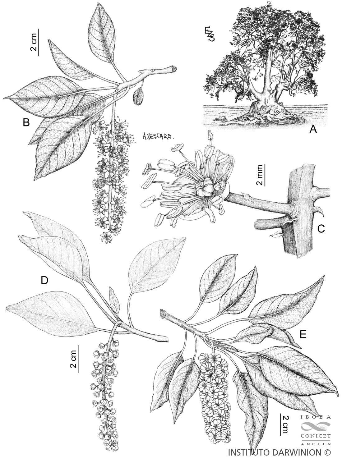 A. Aspecto general de la planta. B. Rama florífera estaminada. C. Flor estaminada. D. Rama florífera pistilada. E. Porción de rama fructífera.