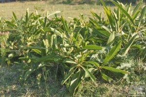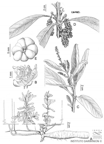 Hierba sufruticosas dioicas, perennes, hasta de 0,5-1 m de alto, con un xilopodio subterráneo ca. 12 cm de diámetro, del que parten numerosos rizomas. Hojas con pecíolos de 1-3 cm de largo o subsésiles; láminas espatuladas a lanceoladas, de 7-35 × 3-4(-7) cm, de ápice mucronado, base atenuada, con el margen levemente ondulado, nervadura central prominente. Inflorescencias en racimos erectos, los estaminados de 4-5 cm de largo, los pistilados hasta de 10 cm de largo, generalmente axilares. Flores estaminadas sésiles o con pedicelos de 2-3 mm de largo; bráctea ca. 2 mm de largo, adpresa a los sépalos, presente o no; bractéolas ausentes; tépalos 4, ovado-elípticos, ca. 2-2,5 × 1,8-2,3 mm, desiguales entre sí; estambres 10-20, de disposición irregular, filamentos ca. 2,5-3,5 mm de largo, anteras ca. 1-1,5 mm de largo; ovario ausente o 2-3-carpelar. Flores pistiladas sésiles o con pedicelos hasta ca. 1 mm de largo; bráctea ca. 2-2,5 mm de largo, aquillada en la base y adpresa al perigonio; bractéolas ausentes; tépalos 4, ovados, de 2-2,5 × 1,6-2,2 mm, desiguales entre sí; estambres ausentes; ovario 6-10-carpelar, carpelos más o menos connados, estilos filiformes conniventes. Fruto una baya de 4-6 mm de diámetro, con 6-9 costillas en su superficie. Semillas no vistas.