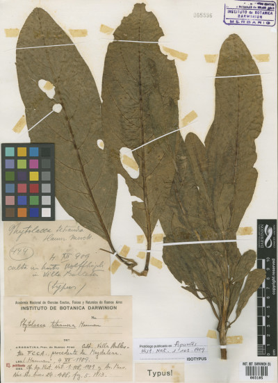 Material Tipo: Argentina. Buenos Aires. Cultivada en Villa Ballester FCCA, procedente de Magdalena, Feb 1906/4 Dic 1909, L. L. Hauman-Merck s.n. (BAA 00001198, Foto Serie Field Mus. 5720, SI 003105, SI 003106).