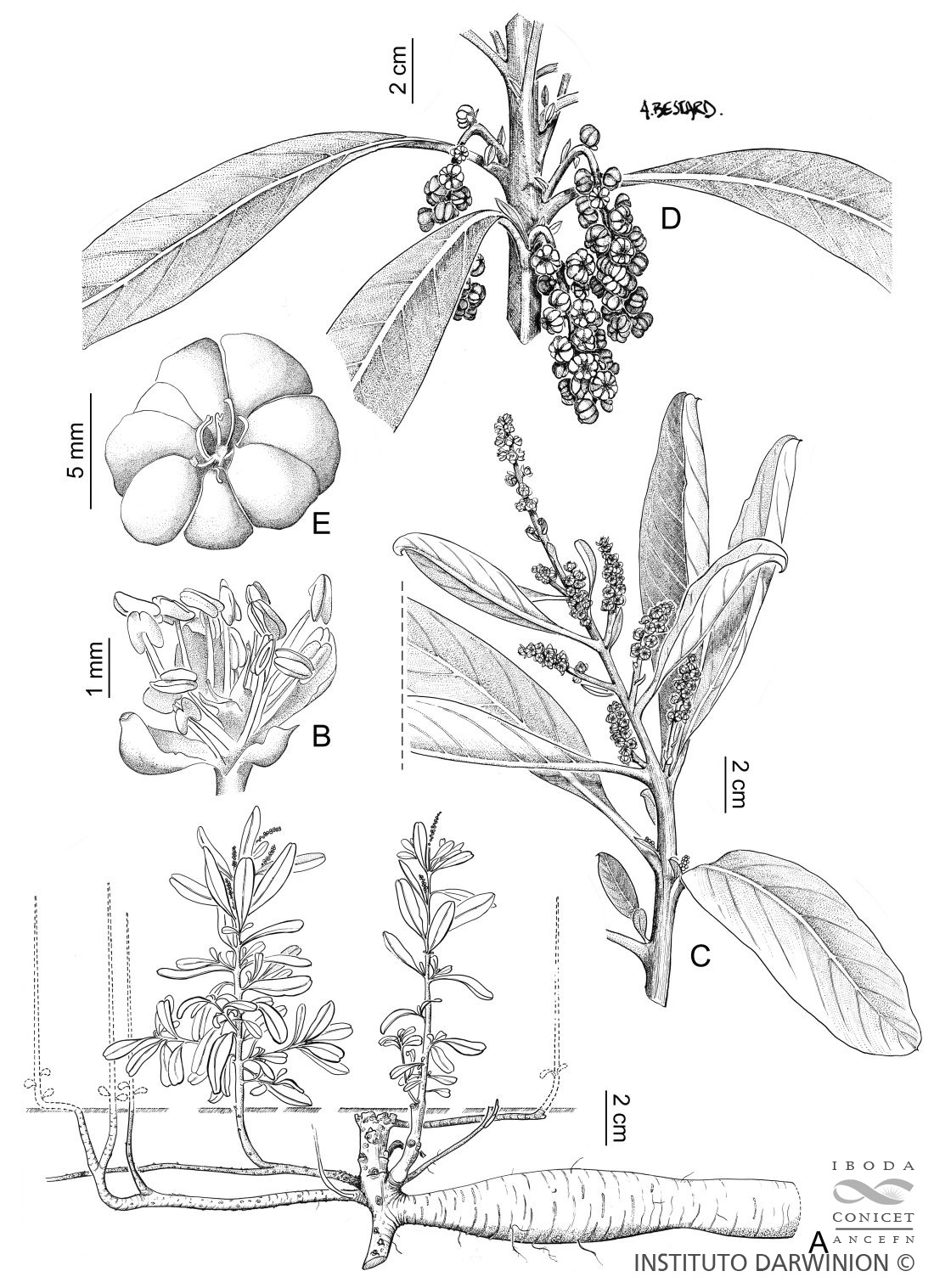 A. Aspecto general de la planta, mostrando el xilopodio. B. Flor estaminada. C. Porción de rama florífera pistilada. D. Porción de rama fructífera. E. Detalle del ovario, vista apical.