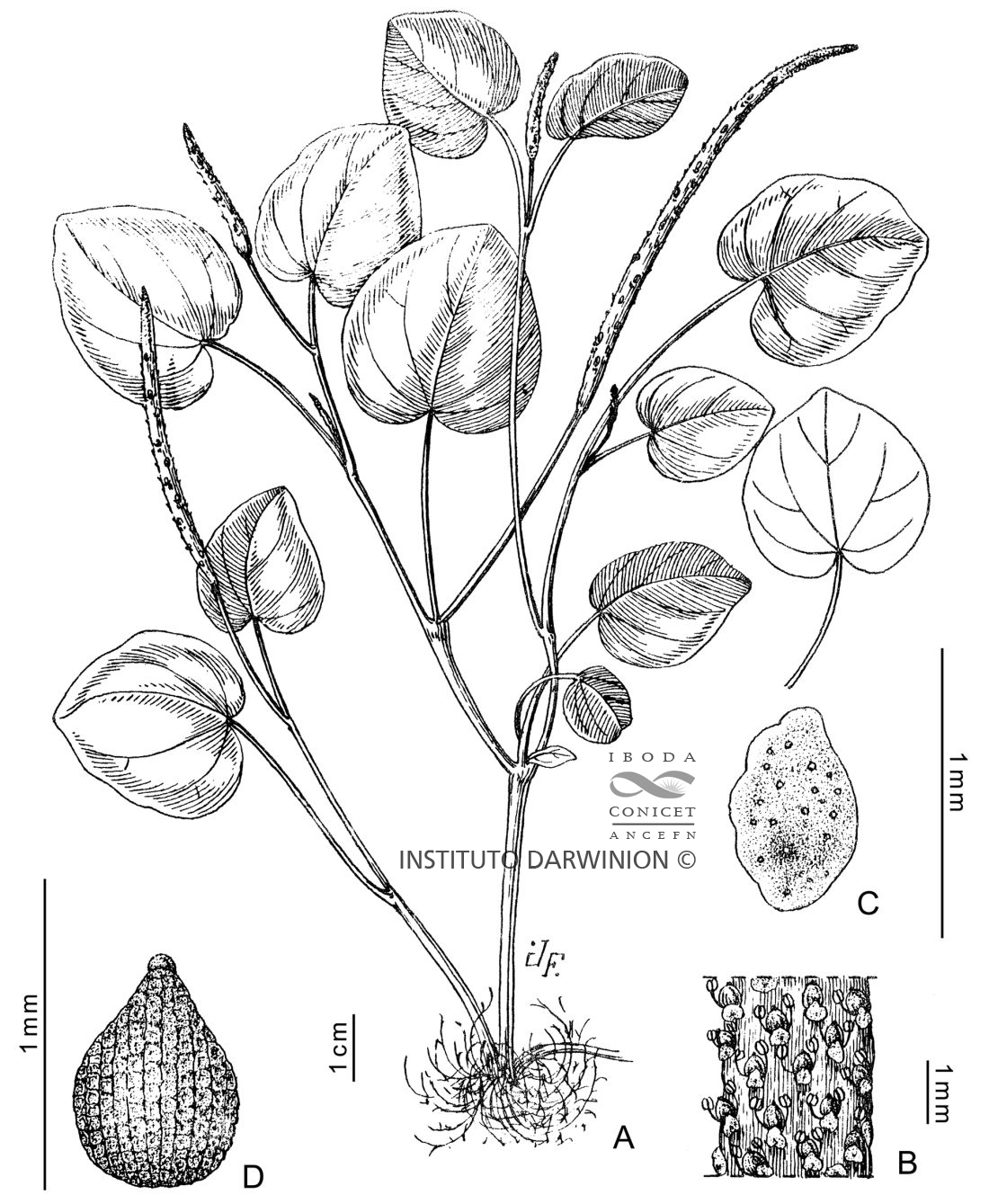 Hierbas terrestres, erectas, de 15-40 cm de alto; tallos con entrenudos de 2,5-9 cm de largo, glabros. Hojas alternas, con pecíolos de 1,5-3 cm de largo; láminas orbicular-ovadas, de 2,5-5,5 × 2,5-6 cm, base cordada, ápice brevemente acuminado o subagudo, membranáceas, palmati-5(-7)-nervadas, glabras. Inflorescencias axilares, solitarias, espigas de 5-8 cm de largo; pedúnculos de 2-3,5 cm de largo; brácteas florales ovadas. Frutos ovoides, de 0,5- 0,7 mm de largo, sésiles, de superficie reticulada, estigma apical.