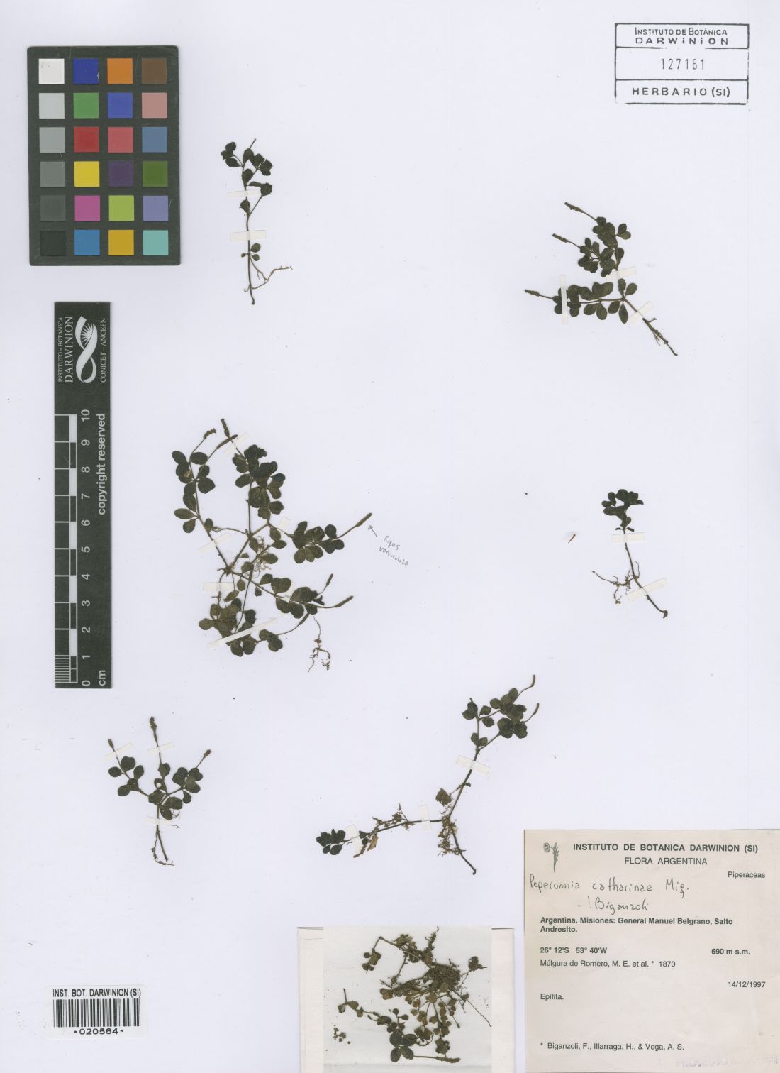Hierbas epífitas, erectas, de 10-15 cm de alto; tallos radicantes en los nudos inferiores, entrenudos de 1-2 cm de largo, pubérulos. Hojas en verticilos de 3-4, a veces opuestas, con pecíolos de 0,1- 0,2 cm de largo; láminas elíptico-obovadas, de 0,4-10 × 0,3-0,8 cm, base aguda, ápice redondeado, cartáceas, palmati-3-nervadas, glabras a esparcidamente pubescentes, cilioladas. Inflorescencias terminales, solitarias, de 1-2,5 × 0,1 cm, densifloras; pedúnculos de 1-1,5 cm de largo, raquis verrucoso; brácteas florales orbiculares. Frutos inmersos en el raquis, ovoideo-elipsoides, de 0,8-1 mm de largo, sésiles, de superficie lisa, con pseudocúpula basal, estigma apical.