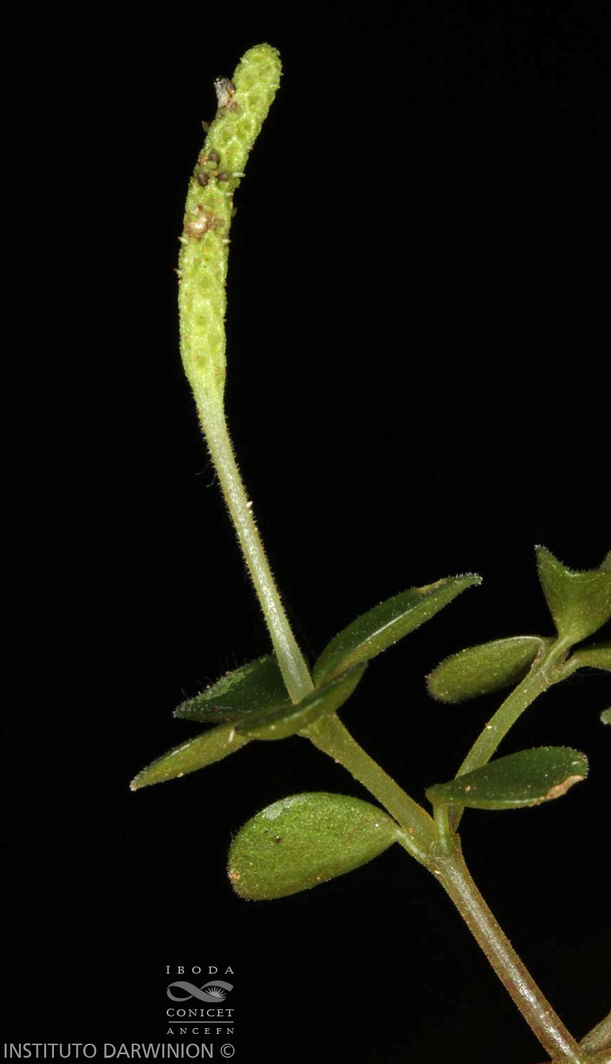 Hierbas epífitas, erectas, de 10-15 cm de alto; tallos radicantes en los nudos inferiores, entrenudos de 1-2 cm de largo, pubérulos. Hojas en verticilos de 3-4, a veces opuestas, con pecíolos de 0,1- 0,2 cm de largo; láminas elíptico-obovadas, de 0,4-10 × 0,3-0,8 cm, base aguda, ápice redondeado, cartáceas, palmati-3-nervadas, glabras a esparcidamente pubescentes, cilioladas. Inflorescencias terminales, solitarias, de 1-2,5 × 0,1 cm, densifloras; pedúnculos de 1-1,5 cm de largo, raquis verrucoso; brácteas florales orbiculares. Frutos inmersos en el raquis, ovoideo-elipsoides, de 0,8-1 mm de largo, sésiles, de superficie lisa, con pseudocúpula basal, estigma apical.