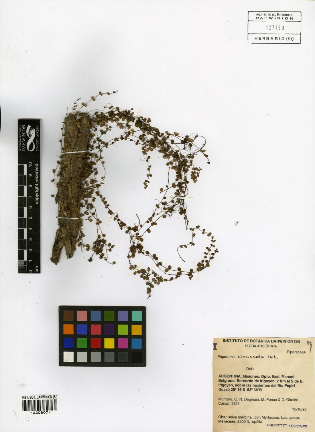 Hierbas epífitas, rastreras, delicadas; tallos filiformes, radicantes en los nudos, glabros o con diminutos pelos crespos esparcidos, entrenudos de 1-2 cm de largo. Hojas opuestas, con pecíolos de 0,5-1 mm de largo; láminas orbiculares, de 4-6 mm de diámetro, base y ápice redondeados, membranáceas, palmati-3- nervadas, pilosas, con pelos crespos o glabrescentes en ambas caras, cilioladas o no. Inflorescencias solitarias y terminales, espigas filiformes de 1-2,5 cm de largo; pedúnculos de 0,5-1 cm de largo, con 2 brácteas pedunculares opuestas en la zona media, elípticas, pilosas, cilioladas, de 0,1 cm de diámetro; brácteas florales orbiculares. Frutos ovoides, de 0,8-1 mm de largo, de superficie lisa, sésiles o estipitados, con estigma apical..