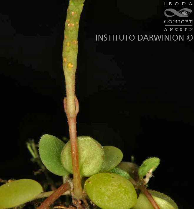 Hierbas epífitas, rastreras, delicadas; tallos filiformes, radicantes en los nudos, glabros o con diminutos pelos crespos esparcidos, entrenudos de 1-2 cm de largo. Hojas opuestas, con pecíolos de 0,5-1 mm de largo; láminas orbiculares, de 4-6 mm de diámetro, base y ápice redondeados, membranáceas, palmati-3- nervadas, pilosas, con pelos crespos o glabrescentes en ambas caras, cilioladas o no. Inflorescencias solitarias y terminales, espigas filiformes de 1-2,5 cm de largo; pedúnculos de 0,5-1 cm de largo, con 2 brácteas pedunculares opuestas en la zona media, elípticas, pilosas, cilioladas, de 0,1 cm de diámetro; brácteas florales orbiculares. Frutos ovoides, de 0,8-1 mm de largo, de superficie lisa, sésiles o estipitados, con estigma apical..