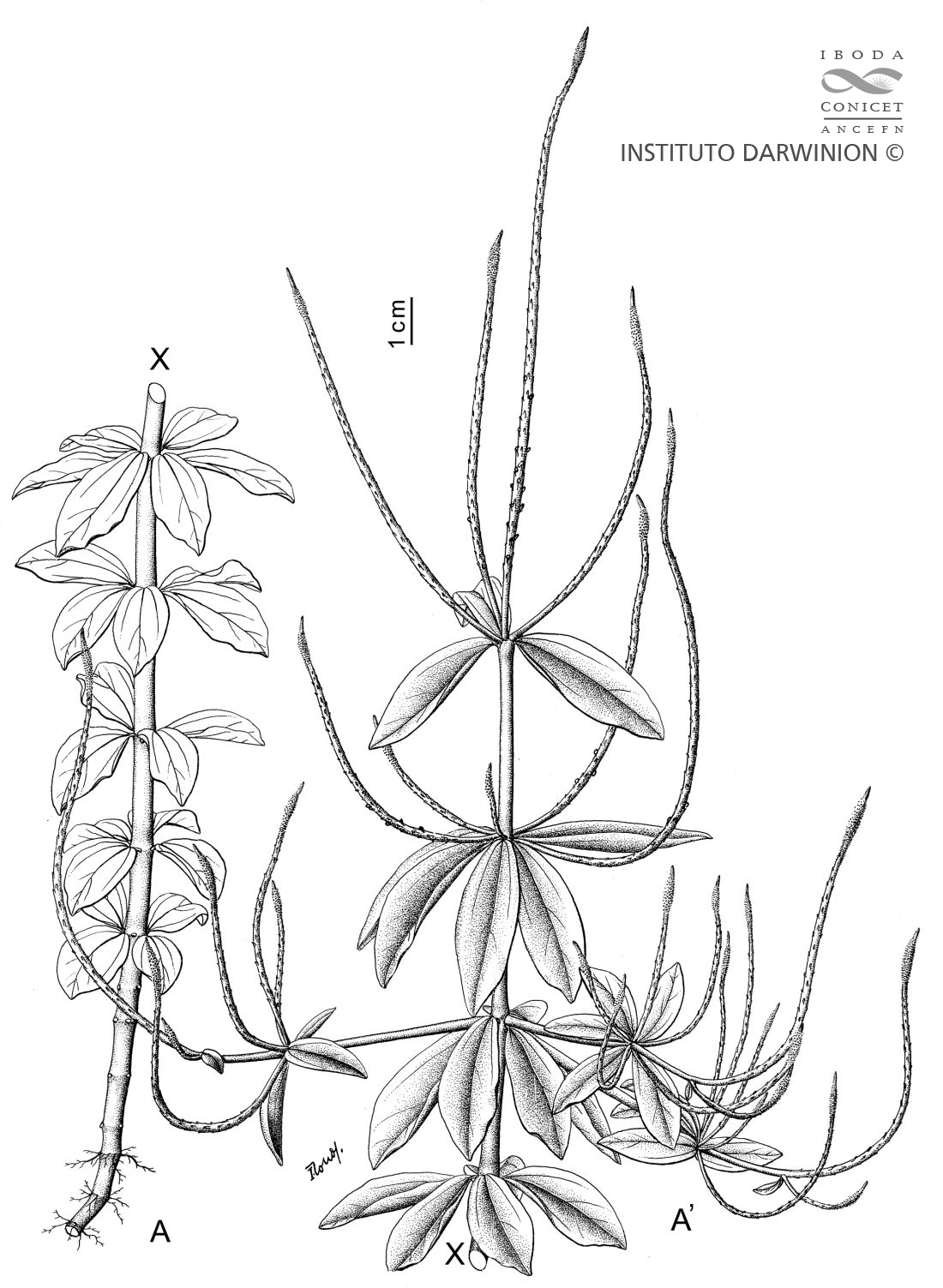 Hierbas terrestres, erectas, de 12-30 cm de alto; tallos estoloníferos y radicantes en los nudos inferiores, entrenudos de 1-3 cm de largo, densamente pubescentes, con tricomas crespos. Hojas en verticilos de 2-4(-5), con pecíolos de 1-2 mm de largo; láminas apicales oblanceoladas, las inferiores espatuladas u elíptico-ovadas, de 1,2-5 × 0,4-1,2 cm, base y ápice agudos a obtusos, membranáceas, palmati-3-nervadas, glabras a esparcidamente pubescentes, cilioladas. Inflorescencias terminales y axilares en verticilos de 2-6, espigas de 6-15 cm de largo; pedúnculos de 1-4 cm de largo; brácteas florales orbiculares. Frutos ovoides, de 0,8-1,2 mm de largo, sésiles, de superficie papilosa, estigma apical.