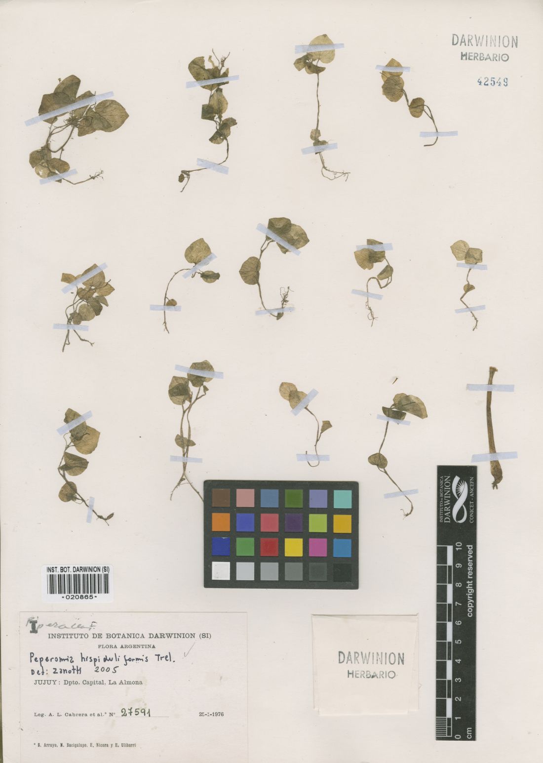 Hierbas terrestres o epífitas, delicadas, erectas, de 6-10 cm de alto; tallos filiformes, radicantes en los nudos inferiores, con tricomas adpresos. Hojas alternas, con pecíolos de 0,5-2 cm de largo; láminas orbicular-ovadas, de 0,8-2 × 0,5-1,5 cm, base cordada, ápice obtuso, membranáceas, palmati-5-nervadas, con tricomas erectos en la cara adaxial. Inflorescencias solitarias, axilares, espigas filiformes, de 2-3,5 cm de largo, laxifloras; pedúnculos de 0,5-2 cm de largo; brácteas florales orbiculares. Frutos ovoides, de 0,5-0,7 cm de largo, estipitados, con tricomas erectos en toda su superficie, estigma apical.