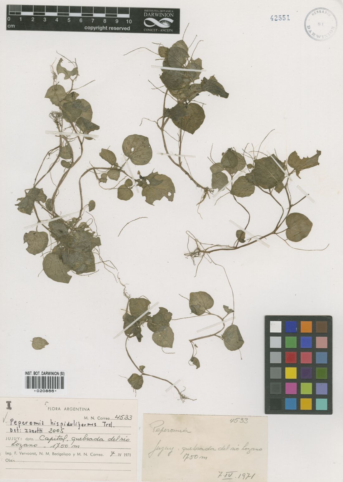 Hierbas terrestres o epífitas, delicadas, erectas, de 6-10 cm de alto; tallos filiformes, radicantes en los nudos inferiores, con tricomas adpresos. Hojas alternas, con pecíolos de 0,5-2 cm de largo; láminas orbicular-ovadas, de 0,8-2 × 0,5-1,5 cm, base cordada, ápice obtuso, membranáceas, palmati-5-nervadas, con tricomas erectos en la cara adaxial. Inflorescencias solitarias, axilares, espigas filiformes, de 2-3,5 cm de largo, laxifloras; pedúnculos de 0,5-2 cm de largo; brácteas florales orbiculares. Frutos ovoides, de 0,5-0,7 cm de largo, estipitados, con tricomas erectos en toda su superficie, estigma apical.