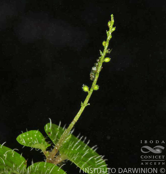 Hierbas terrestres o epífitas, delicadas, erectas, de 6-10 cm de alto; tallos filiformes, radicantes en los nudos inferiores, con tricomas adpresos. Hojas alternas, con pecíolos de 0,5-2 cm de largo; láminas orbicular-ovadas, de 0,8-2 × 0,5-1,5 cm, base cordada, ápice obtuso, membranáceas, palmati-5-nervadas, con tricomas erectos en la cara adaxial. Inflorescencias solitarias, axilares, espigas filiformes, de 2-3,5 cm de largo, laxifloras; pedúnculos de 0,5-2 cm de largo; brácteas florales orbiculares. Frutos ovoides, de 0,5-0,7 cm de largo, estipitados, con tricomas erectos en toda su superficie, estigma apical.