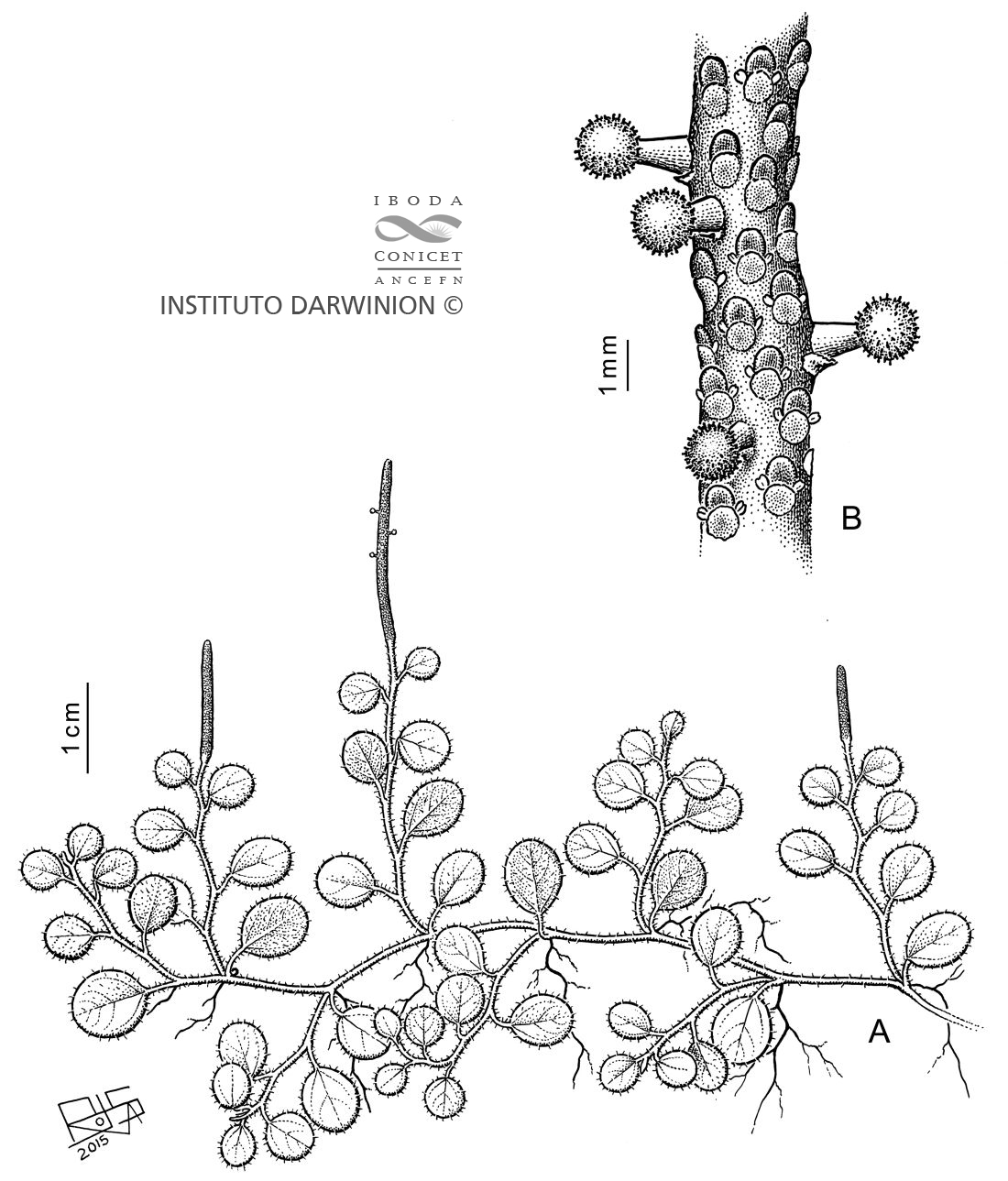 Hierbas epífitas, cespitosas, delicadas; tallos filiformes, radicantes en los nudos, entrenudos de 1-2 cm de largo, con pelos crespos. Hojas alternas, con pecíolos de 0,2-0,5 cm de largo; láminas orbiculares a orbicular-elípticas, de 0,7-1 × 0,5-0,8 cm, base aguda a obtusa, ápice redondeado a obtuso, membranáceas, palmati-3-nervadas, cilioladas, pubescentes. Inflorescencias solitarias, terminales, con espigas de 1-1,7 cm de largo; pedúnculos de 0,3-0,6 cm de largo, con dos brácteas pedunculares opuestas, espatuladas, de 1 mm de largo; brácteas florales orbiculares. Frutos ovoides, de 1 mm de largo, generalmente sésiles, a veces estipitados, con superficie lisa a papilosa, estigma subapical.