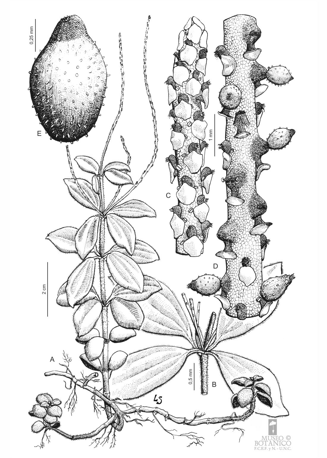 A. Planta. B. Nudo con un verticilo de cuatro hojas. C. Sector de inflorescencia florífera. D. Sector de inflorescencia fructífera. E. Fruto.