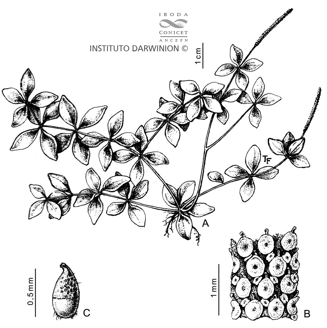 A. Planta. B. Detalle de la espiga. C. Fruto. Tomado de Flora Ilustrada de la Provincia de Tucumán 1: 33, fig. 9. 1977 (como P. reflexa).