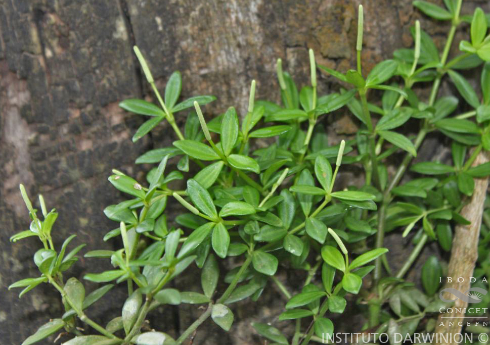 Hierbas epífitas, erectas, de 12-40 cm de alto; tallos curvados hacia el ápice de la planta, con entrenudos de 1-11 cm de largo, radicantes en los nudos inferiores, glabros o escasamente puberulentos, con tricomas diminutos. Hojas dispuestas en verticilos de 2-4(-5), con pecíolos de 1-7 mm de largo; láminas elípticas a oblongas, de 1-2,5 × 0,4-1 cm, base aguda, ápice obtuso, margen revoluto o no, coriáceas, palmati-3-nervadas, glabras. Inflorescencias solitarias y terminales con espigas densifloras de 2-5 cm de largo; pedúnculos de 1-2,5 cm de largo; brácteas florales orbiculares; raquis de la inflorescencia hirsuto. Frutos oblongo-elipsoides, de 1 mm de largo, sésiles, de superficie lisa, inmersos hasta la mitad del raquis, con pseudocúpula, ápice levemente rostrado, estigma apical.
