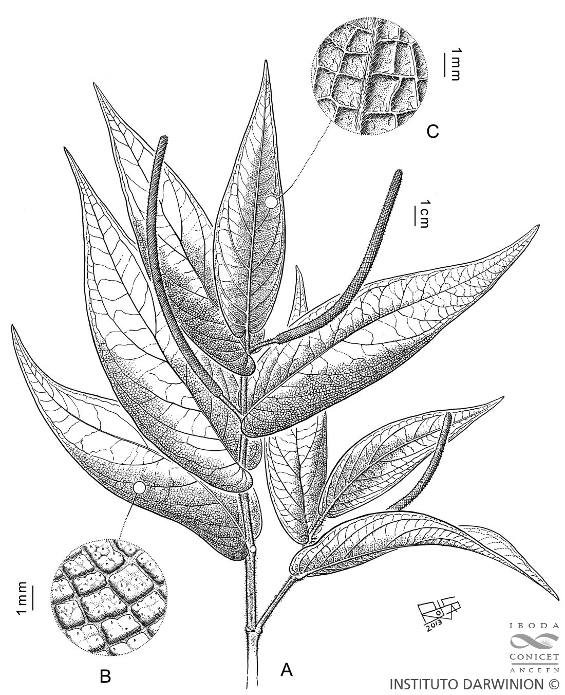 A. Rama fértil. B. Superficie adaxial de la hoja. C. Superficie abaxial de la hoja.