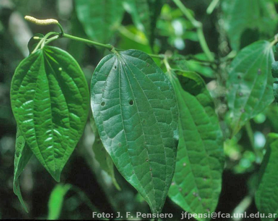 Arbustos o arbolitos de 1-4(-6) m de alto; tallos con entrenudos de 4-10 cm de largo, glabros a esparcidamente pilosos, con pelos diminutos. Hojas con pecíolos de 0,5-4 cm de largo, canaliculados, glabros o esparcidamente pilosos con pelos diminutos; láminas elípticas a ovado-lanceoladas, de 5-13 × 3-8 cm, base obtusa, ápice con acumen breve, margen ligeramente revoluto, cartáceas, palmatinervadas, superficie adaxial lisa, glabra, superficie abaxial lisa, glabra a esparcidamente pilosa, con pelos diminutos sobre los nervios. Inflorescencias con espigas de 3,5-7 cm de largo, erectas a ligeramente curvadas; pedúnculos de 0,6-1,5 cm de largo, glabros o esparcidamente pilosos, con pelos diminutos. Frutos ovoides, de 1,5-2 mm de largo, lisos, negros, esparcidamente pilosos en la base.