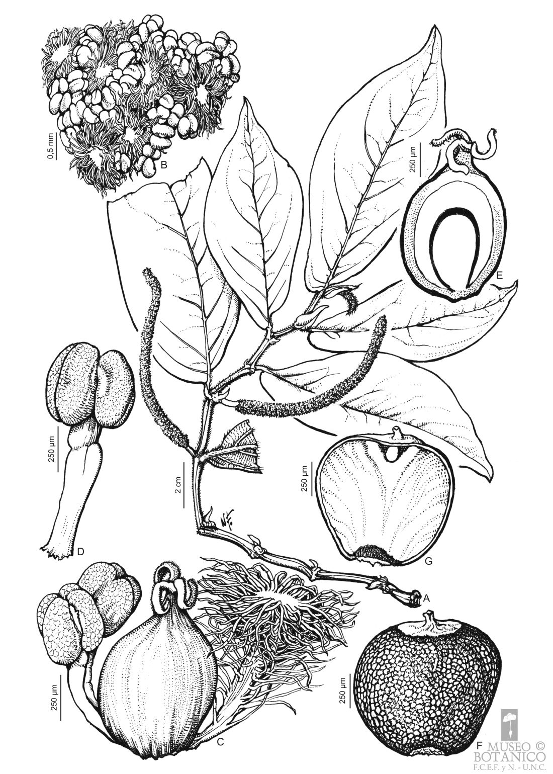A. Rama florífera. B. Detalle aumentado de la espiga. C. Flor con la bráctea. D. Estambre. E. Transcorte por ovario. F. Semilla. G. Corte por semilla.