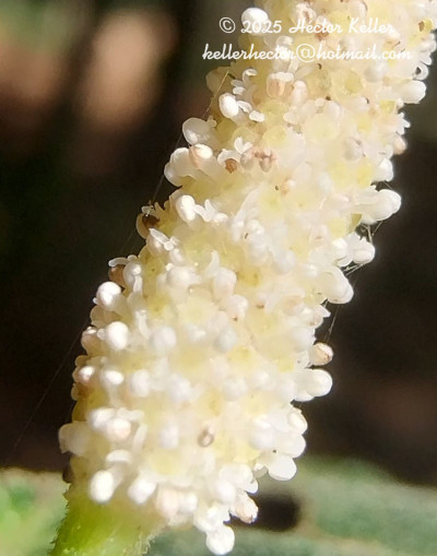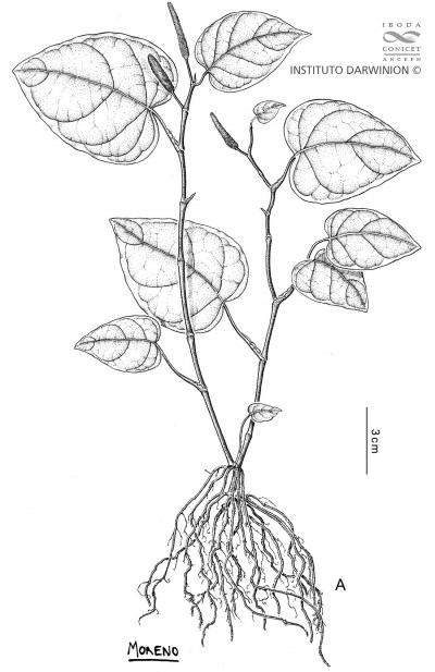 Arbustos de 0,3-1 m de alto, decumbentes a erectos; tallos con entrenudos de 3-8(-9) cm de largo, glabros a esparcidamente pilosos, radicantes en los nudos basales. Hojas con pecíolos de 0,5-3(-5) cm de largo, glabros a esparcidamente pilosos, canaliculados; láminas deltoideas, de 6-14 × 3-9(-11) cm, base cordada, ápice brevemente acuminado, cartáceas, pinnatinervadas, con 7-9 nervios, superficie adaxial y abaxial lisas, glabras entre los nervios, éstos esparcidamente pilosos. Inflorescencias en espigas de 3-6 cm de largo, erectas; pedúnculos de 0,8-2 cm de largo, glabros a esparcidamente pilosos. Frutos obovoides, de 0,8-1 mm de largo, trígonos, ápice convexo, glabros, rojo-castaños.