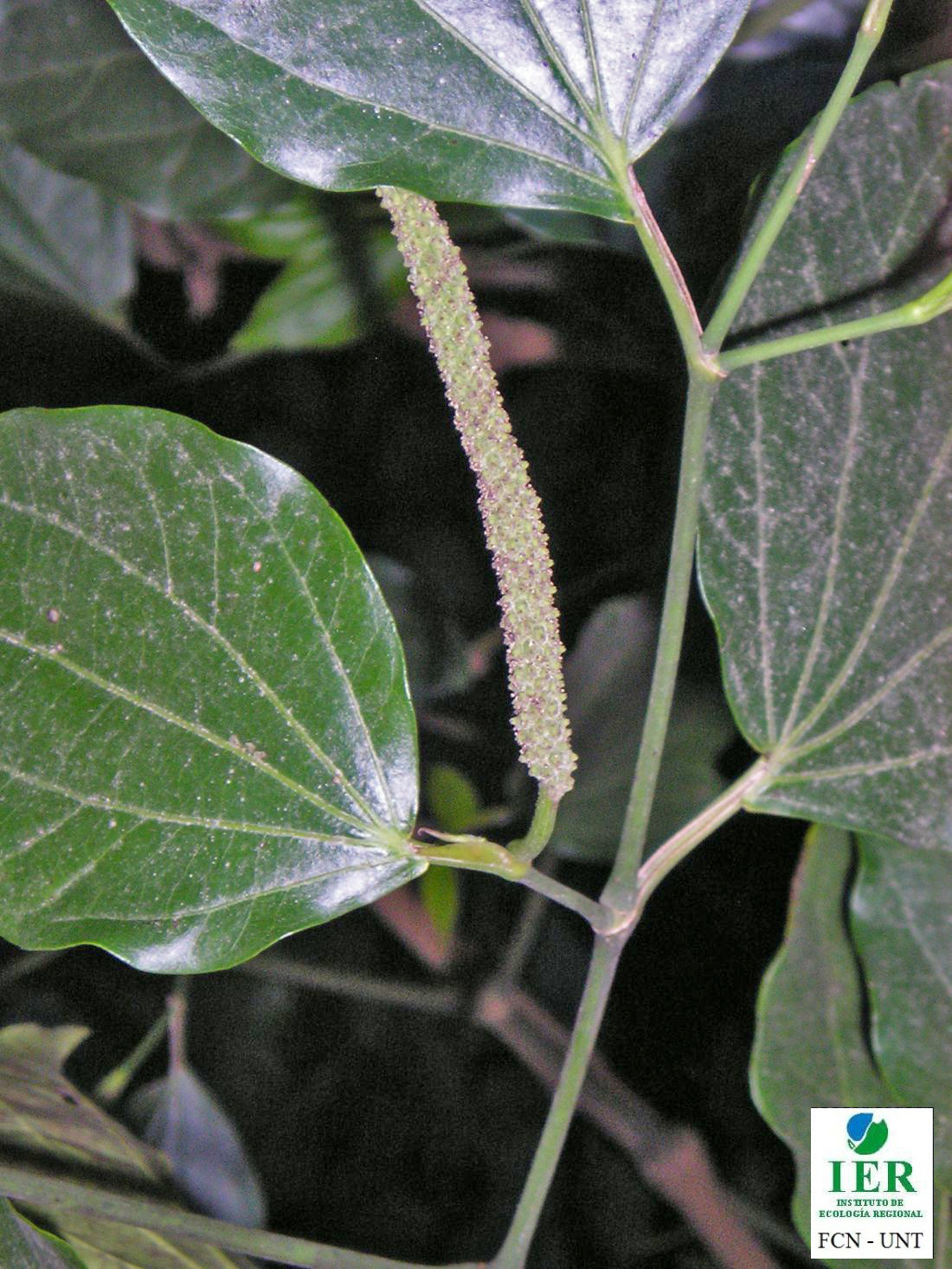 Arbustos o arbolitos de 3-8 m de alto; tallos con entrenudos de 1,5-5 cm de largo, glabros. Hojas con pecíolos de 1,5-2(-3) cm de largo, lanosos, canaliculados; láminas elípticas a ovadolanceoladas, de 5-15 × 4-8(-10) cm, base asimétrica a obtusa, ápice acuminado y falcado, cartáceas, palmatinervadas, superficie adaxial lisa, glabra, superficie abaxial esparcidamente pubescente entre los nervios y lanosa entre y sobre los nervios en la zona basal de la lámina. Inflorescencias en espigas de 5-7 cm de largo, erectas a ligeramente curvadas; pedúnculos de 1-2 cm de largo, lanosos. Frutos ovoides, de 0,5-1 mm de largo, lisos, glabros, negros.