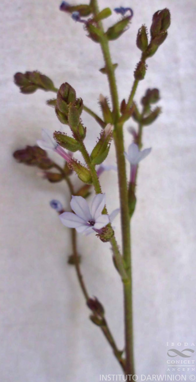 Hierba perenne sufruticosa de 0,3-1(-1,5) m de alto, ramas erectas o apoyantes, con glándulas capitadas cuando jóvenes. Hojas con pecíolo ca. 1 cm de largo; láminas ovado-oblongas, de 5-10 × 2-5 cm, de base redondeada, atenuada, ápice acuminado. Flores ca. 2 cm de largo; brácteas deltoideas ca. 6 mm de largo, glandulosas; cáliz de 5-10 mm de largo × 2-4 mm de diámetro, con glándulas estipitadas de 1 mm de largo en su porción superior, lóbulos triangulares, de 1-3 mm de largo; corola con el tubo de 10-15 mm de largo × 1-3 mm de diámetro, glabra, celeste a azul intenso; estambres con filamentos ca. 6 mm de largo; anteras lineares, de 1,5-2 mm de largo, de dehiscencia longitudinal. Fruto una cápsula de contorno oblongo, de 4-5 mm de largo, con ápice agudo, de dehiscencia loculicida, rodeada por el cáliz persistente. Semilla 1, ca. 5-6 mm de largo, levemente costada, glabra, oscura.
