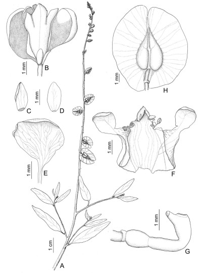 Hierbas de 13-90 cm de alto; tallos con pubescencia de tricomas glandulosos menores a 0,5 mm de largo. Hojas alternas; pecíolos de 2-3 mm de largo, pubescentes; láminas lanceoladas a oblongas, de 22-42 × 7-27 mm, ápice agudo a obtuso, mucronado, glabras o glabrescentes. Infl orescencias de 8-20 cm de largo; raquis pubescentes, nectarios extraflorales ausentes; brácteas triangulares, de 2-3,5 mm de largo, pubescentes; bractéolas de menor tamaño. Flores ca. 5 mm de largo, blancas a violáceas de ápice amarillento; pedicelos ca. 0,8 mm de largo; sépalos externos glabros; sépalo externo inferior elíptico, ca. 1,5-2 × 1 mm, ápice agudo; sépalos externos superiores elípticos, ca. 1,3 × 1 mm, ápice agudo; sépalos internos “alas” orbiculares, ca. 3,5 × 2,8 mm, ápice obtuso, glabros; quilla 3-lobulada ca. 3,8 mm de largo, pétalos laterales ca. 3 mm de largo, ápice obtuso, levemente pubescentes o glabros en la porción media adaxial, fusionados con la vaina estaminal; estambres 8, vaina estaminal ca. 2,5 mm de largo, porción libre de los filamentos estaminales separados entre sí en grupos de cuatro por una barra glabra en forma de capucha; ovario de contorno oblongo, ca. 1 × 0,9 mm, glabro; estilo curvo ca. 1,5 mm de largo, ensanchado distalmente, no auriculado, glabro, área estigmática con el lóbulo estéril agudo, lóbulo fértil 1-tuberculado. Fruto samaroide cordiforme, de 10-13 × 8-13 mm, simétrico, glabro. Semillas 2.