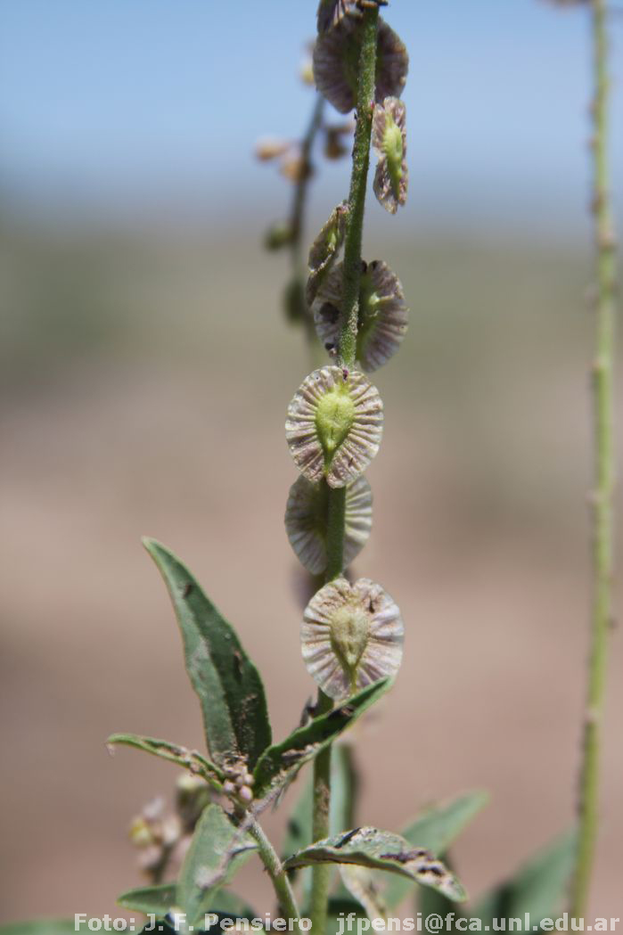 Hierbas de 13-90 cm de alto; tallos con pubescencia de tricomas glandulosos menores a 0,5 mm de largo. Hojas alternas; pecíolos de 2-3 mm de largo, pubescentes; láminas lanceoladas a oblongas, de 22-42 × 7-27 mm, ápice agudo a obtuso, mucronado, glabras o glabrescentes. Infl orescencias de 8-20 cm de largo; raquis pubescentes, nectarios extraflorales ausentes; brácteas triangulares, de 2-3,5 mm de largo, pubescentes; bractéolas de menor tamaño. Flores ca. 5 mm de largo, blancas a violáceas de ápice amarillento; pedicelos ca. 0,8 mm de largo; sépalos externos glabros; sépalo externo inferior elíptico, ca. 1,5-2 × 1 mm, ápice agudo; sépalos externos superiores elípticos, ca. 1,3 × 1 mm, ápice agudo; sépalos internos “alas” orbiculares, ca. 3,5 × 2,8 mm, ápice obtuso, glabros; quilla 3-lobulada ca. 3,8 mm de largo, pétalos laterales ca. 3 mm de largo, ápice obtuso, levemente pubescentes o glabros en la porción media adaxial, fusionados con la vaina estaminal; estambres 8, vaina estaminal ca. 2,5 mm de largo, porción libre de los filamentos estaminales separados entre sí en grupos de cuatro por una barra glabra en forma de capucha; ovario de contorno oblongo, ca. 1 × 0,9 mm, glabro; estilo curvo ca. 1,5 mm de largo, ensanchado distalmente, no auriculado, glabro, área estigmática con el lóbulo estéril agudo, lóbulo fértil 1-tuberculado. Fruto samaroide cordiforme, de 10-13 × 8-13 mm, simétrico, glabro. Semillas 2.