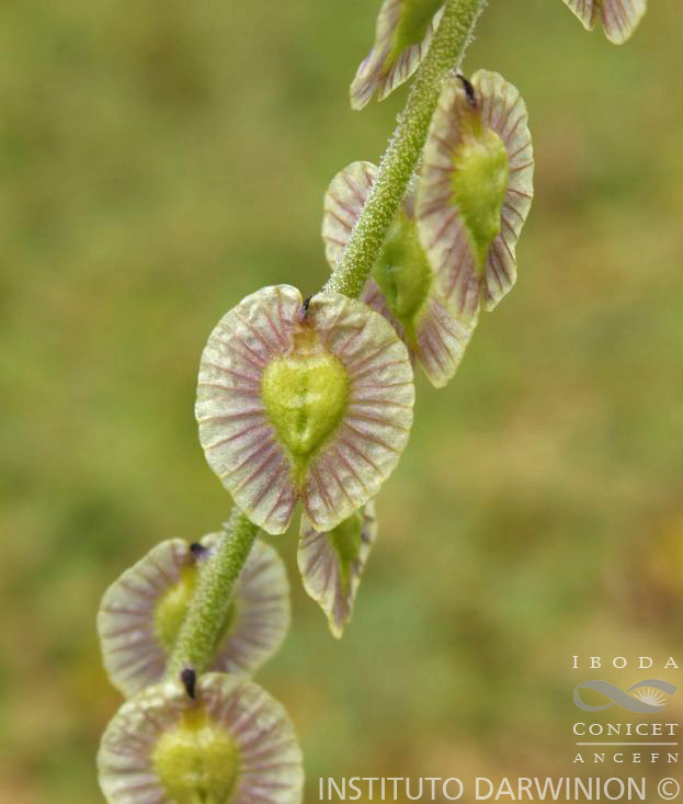 Hierbas de 13-90 cm de alto; tallos con pubescencia de tricomas glandulosos menores a 0,5 mm de largo. Hojas alternas; pecíolos de 2-3 mm de largo, pubescentes; láminas lanceoladas a oblongas, de 22-42 × 7-27 mm, ápice agudo a obtuso, mucronado, glabras o glabrescentes. Infl orescencias de 8-20 cm de largo; raquis pubescentes, nectarios extraflorales ausentes; brácteas triangulares, de 2-3,5 mm de largo, pubescentes; bractéolas de menor tamaño. Flores ca. 5 mm de largo, blancas a violáceas de ápice amarillento; pedicelos ca. 0,8 mm de largo; sépalos externos glabros; sépalo externo inferior elíptico, ca. 1,5-2 × 1 mm, ápice agudo; sépalos externos superiores elípticos, ca. 1,3 × 1 mm, ápice agudo; sépalos internos “alas” orbiculares, ca. 3,5 × 2,8 mm, ápice obtuso, glabros; quilla 3-lobulada ca. 3,8 mm de largo, pétalos laterales ca. 3 mm de largo, ápice obtuso, levemente pubescentes o glabros en la porción media adaxial, fusionados con la vaina estaminal; estambres 8, vaina estaminal ca. 2,5 mm de largo, porción libre de los filamentos estaminales separados entre sí en grupos de cuatro por una barra glabra en forma de capucha; ovario de contorno oblongo, ca. 1 × 0,9 mm, glabro; estilo curvo ca. 1,5 mm de largo, ensanchado distalmente, no auriculado, glabro, área estigmática con el lóbulo estéril agudo, lóbulo fértil 1-tuberculado. Fruto samaroide cordiforme, de 10-13 × 8-13 mm, simétrico, glabro. Semillas 2.