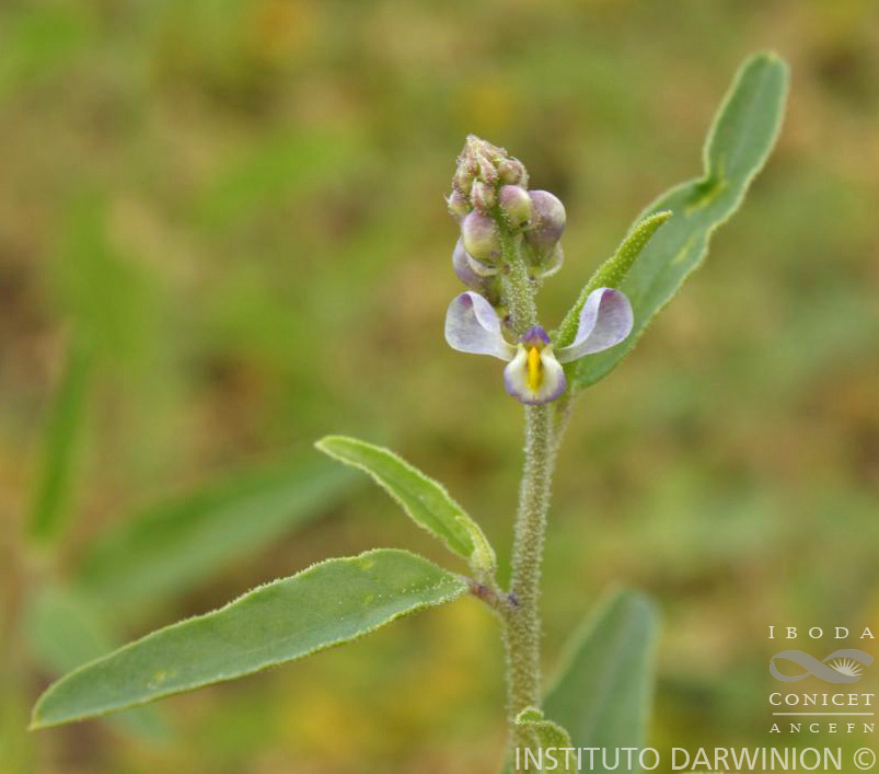 Hierbas de 13-90 cm de alto; tallos con pubescencia de tricomas glandulosos menores a 0,5 mm de largo. Hojas alternas; pecíolos de 2-3 mm de largo, pubescentes; láminas lanceoladas a oblongas, de 22-42 × 7-27 mm, ápice agudo a obtuso, mucronado, glabras o glabrescentes. Infl orescencias de 8-20 cm de largo; raquis pubescentes, nectarios extraflorales ausentes; brácteas triangulares, de 2-3,5 mm de largo, pubescentes; bractéolas de menor tamaño. Flores ca. 5 mm de largo, blancas a violáceas de ápice amarillento; pedicelos ca. 0,8 mm de largo; sépalos externos glabros; sépalo externo inferior elíptico, ca. 1,5-2 × 1 mm, ápice agudo; sépalos externos superiores elípticos, ca. 1,3 × 1 mm, ápice agudo; sépalos internos “alas” orbiculares, ca. 3,5 × 2,8 mm, ápice obtuso, glabros; quilla 3-lobulada ca. 3,8 mm de largo, pétalos laterales ca. 3 mm de largo, ápice obtuso, levemente pubescentes o glabros en la porción media adaxial, fusionados con la vaina estaminal; estambres 8, vaina estaminal ca. 2,5 mm de largo, porción libre de los filamentos estaminales separados entre sí en grupos de cuatro por una barra glabra en forma de capucha; ovario de contorno oblongo, ca. 1 × 0,9 mm, glabro; estilo curvo ca. 1,5 mm de largo, ensanchado distalmente, no auriculado, glabro, área estigmática con el lóbulo estéril agudo, lóbulo fértil 1-tuberculado. Fruto samaroide cordiforme, de 10-13 × 8-13 mm, simétrico, glabro. Semillas 2.